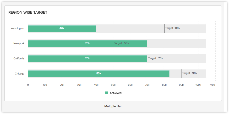 La scheda Dashboards è stata rinominata in Analytics per gli account selezionati.Facciamo un esempio per comprendere meglio. Supponiamo che Zylker Inc. voglia impostare obiettivi per un periodo di sei mesi per ciascuna regione e monitorare eventuali scostamenti. Possono scegliere lo stile multibar target meter e impostare l'obiettivo per i responsabili vendite. Inoltre, possono anche impostare obiettivi individuali per ciascun responsabile vendite nel caso in cui il fatturato previsto vari da regione a regione. Questi dati forniranno un quadro completo e più chiaro dell'obiettivo impostato per ciascuna regione o individuo e dell'obiettivo raggiunto.