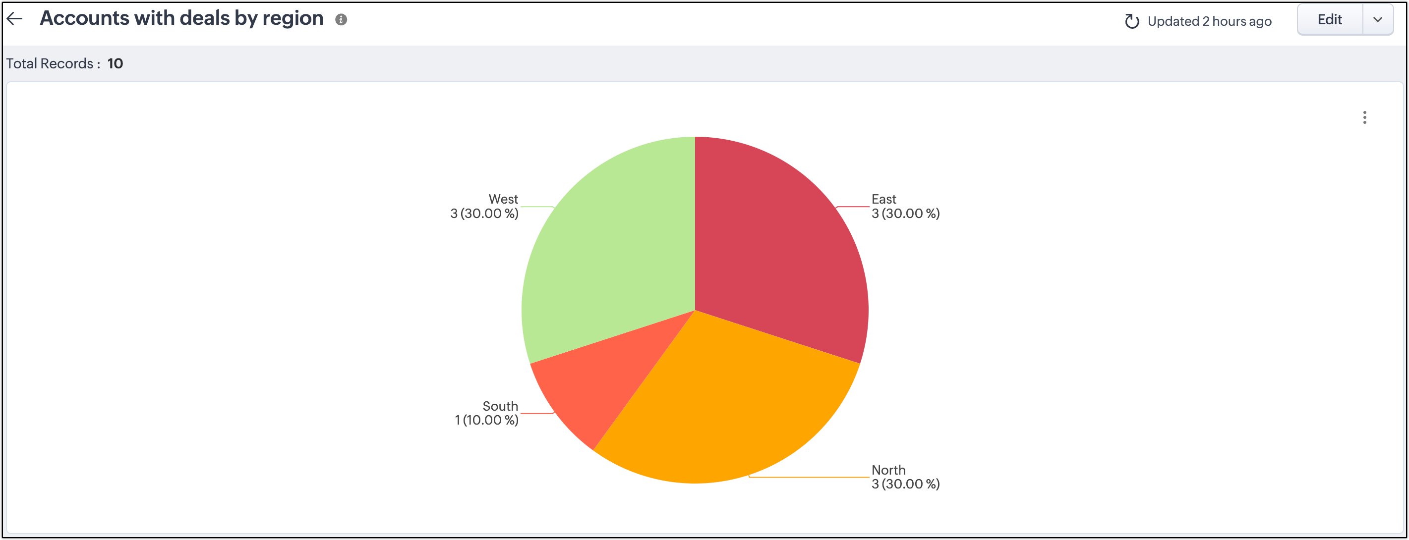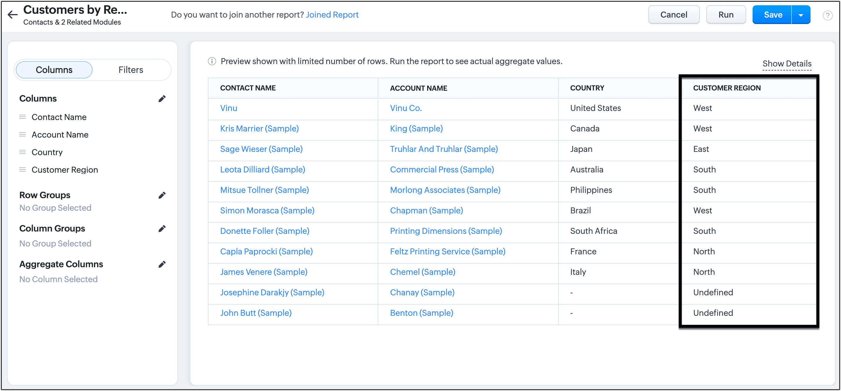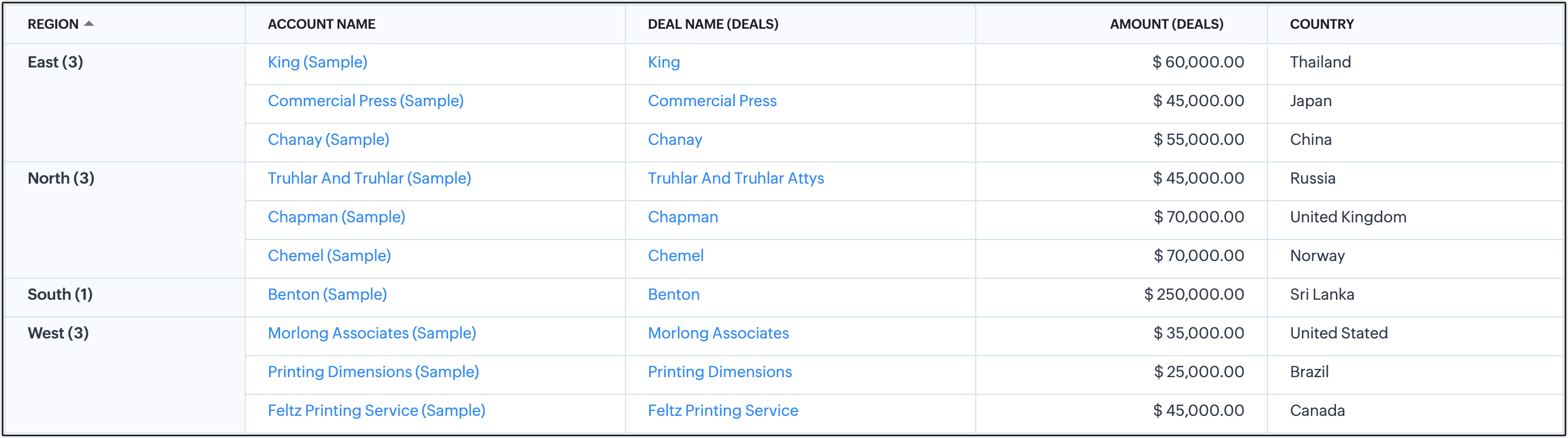 Consideriamo l'esempio di un responsabile vendite che analizza un report basato sul settore per creare una strategia di vendita in base al paese di provenienza dei propri clienti. Il suo obiettivo è raggiungerli ottenendo informazioni sul loro comportamento di acquisto per regione dal report. Il report include dettagli come 'Nome account', 'Nome trattativa', 'Importo' e 'Paese'.