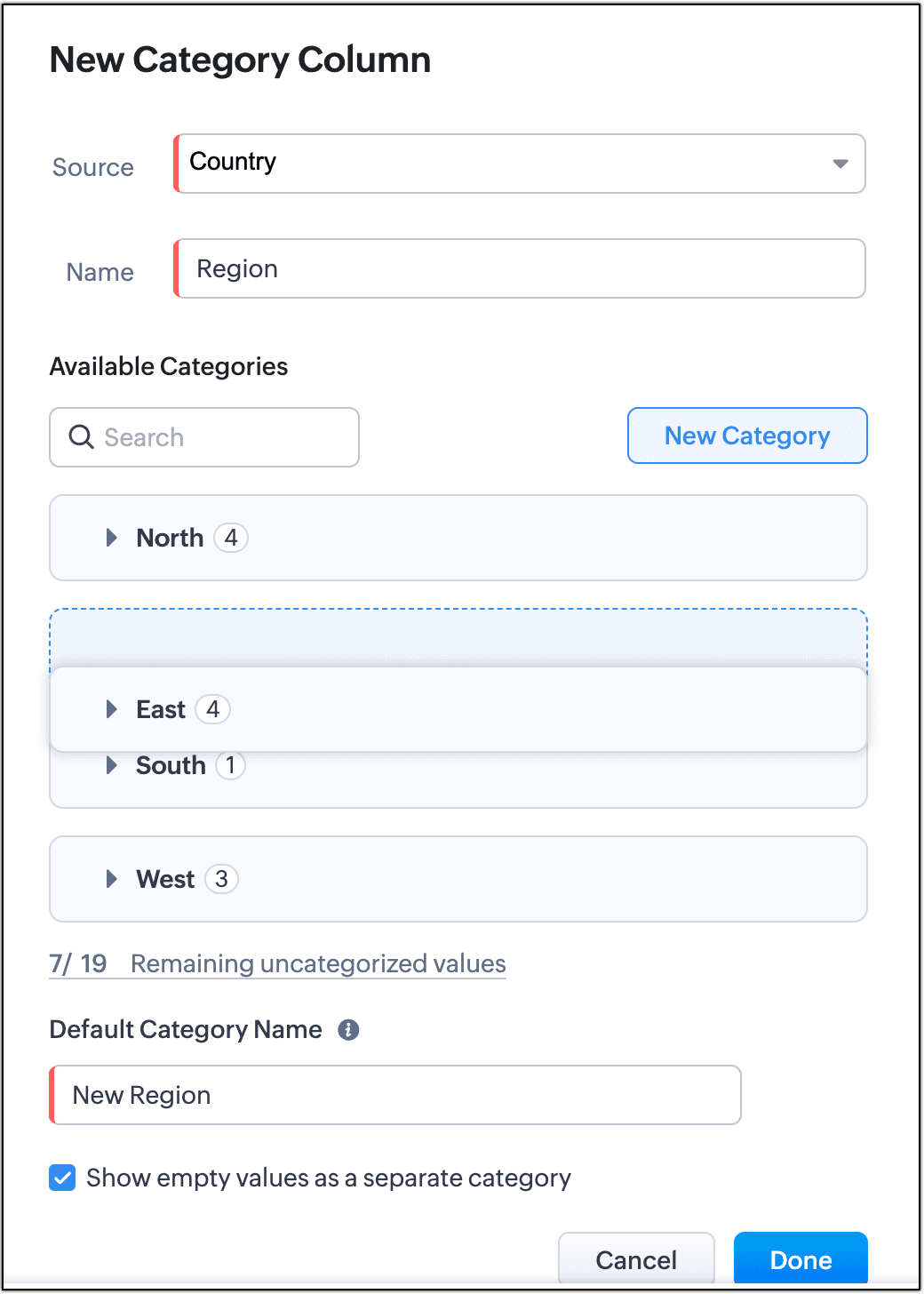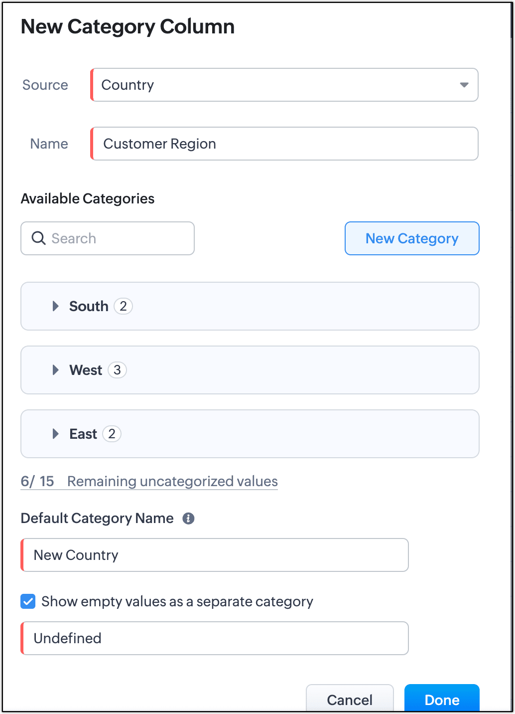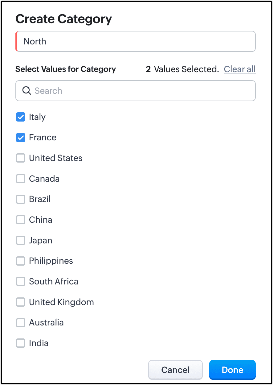 - Inserire i nomi delle categorie e selezionare i valori per ciascuna e cliccare Done. Per l'esempio, abbiamo inserito altre tre categorie Sud, Est e Ovest, e selezionato i paesi che rientrano nelle rispettive regioni.