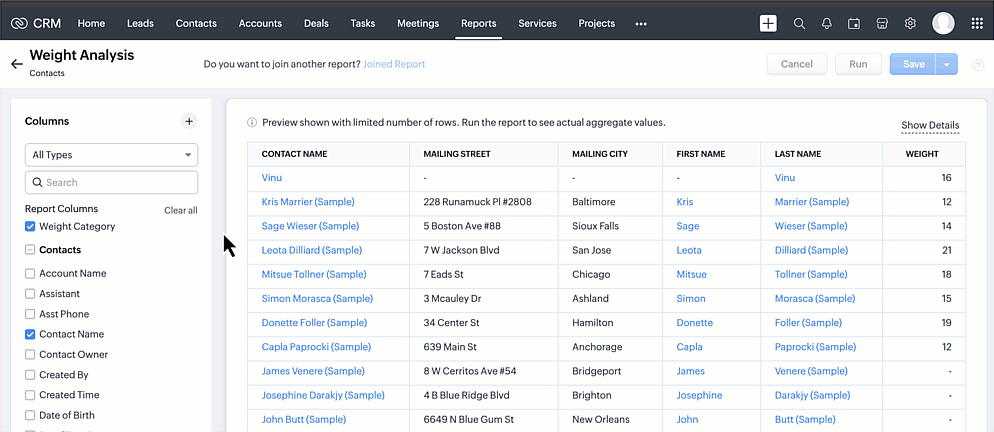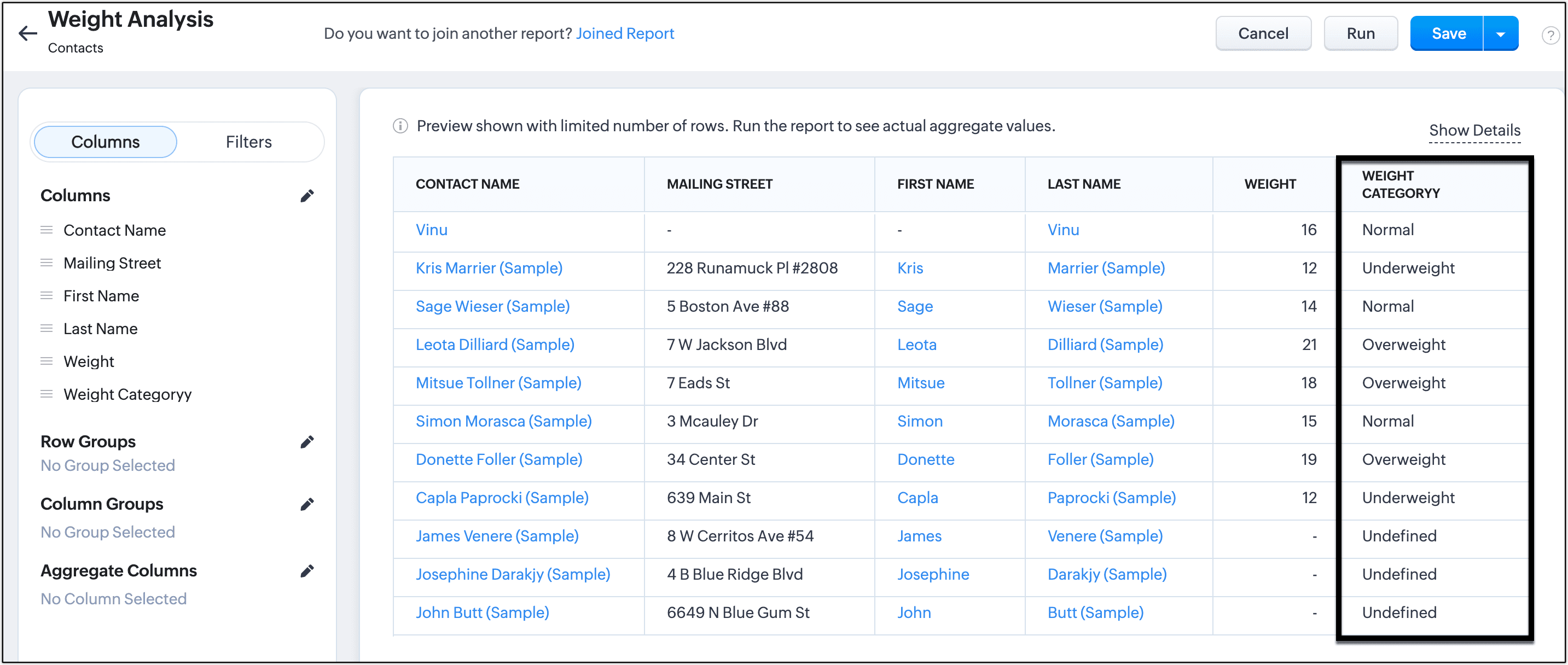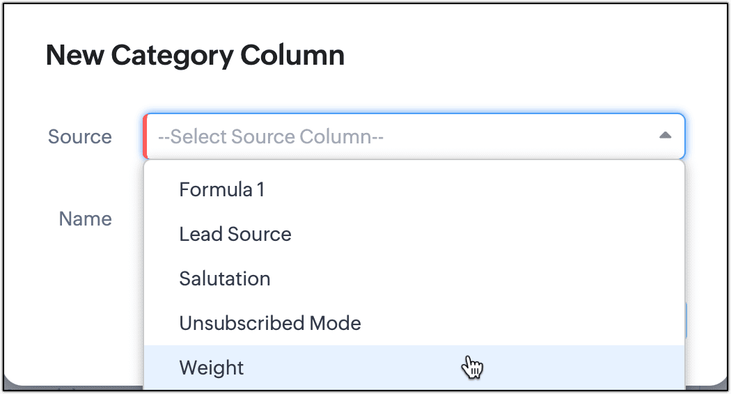 - Selezionare la sorgente della nuova colonna di categoria da uno dei campi numerici disponibili. I campi numerici supportati sono numero, intero lungo, valuta, percentuale, decimale, formula e roll up summary. La colonna sorgente è 'Weight' in questo esempio.
