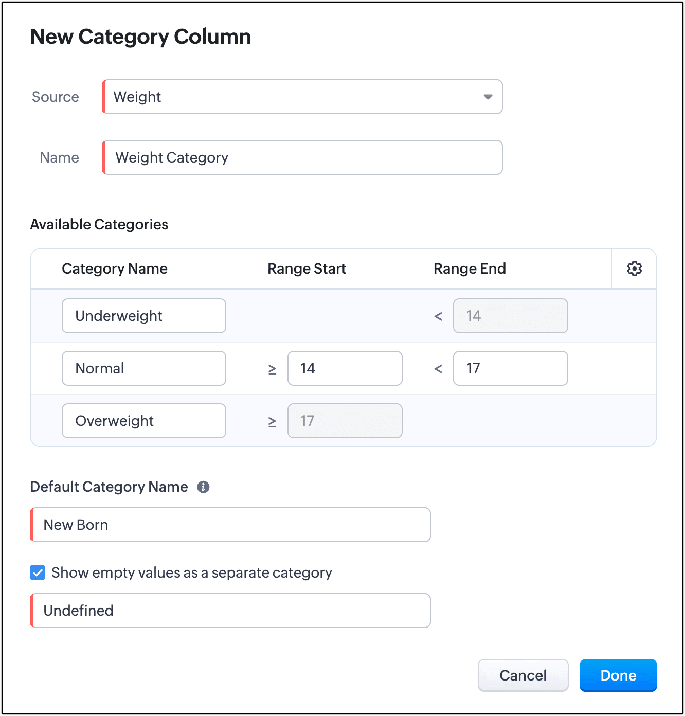 È possibile scegliere di mostrare i valori vuoti come categoria separata e denominare la colonna per comprendere facilmente perché quei valori di colonna sono vuoti. In questo esempio sarà 'Undefined'. - Cliccare Done per salvare le modifiche apportate al report.