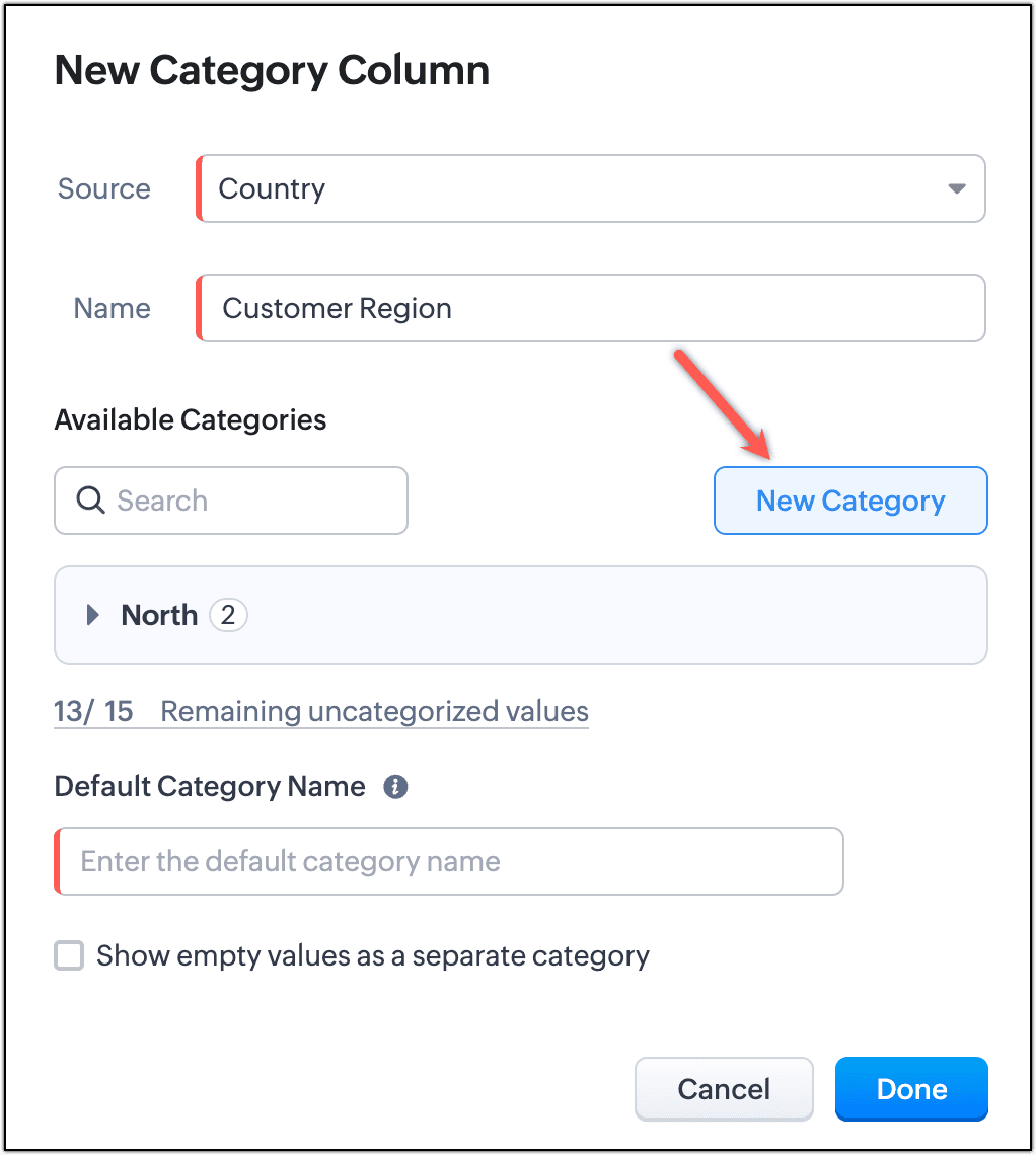 - Inserire il nome della categoria e selezionare i valori che devono essere categorizzati in essa e cliccare Done. Per l'esempio, abbiamo inserito il nome della categoria come 'North' e selezionato i paesi che rientrano nella regione nord.