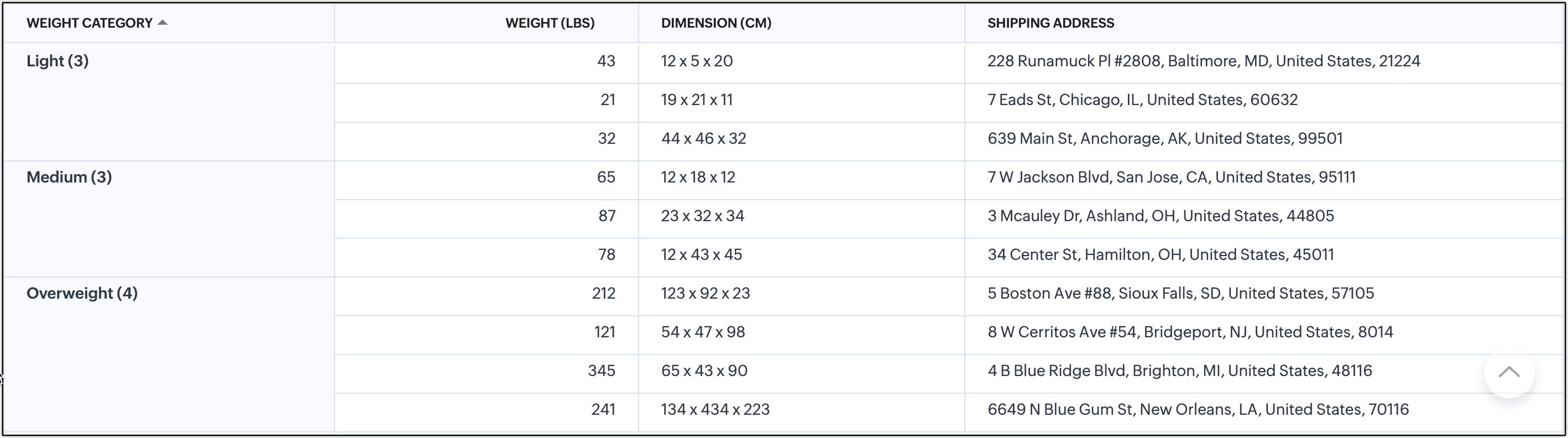 Un responsabile delle consegne pianifica il programma per le consegne dei pacchi, considerando fattori come la dimensione e il peso dei pacchi. Conoscere il peso e la dimensione lo aiuta a scegliere l'opzione di spedizione corretta, soprattutto per gli articoli più pesanti. La categoria di peso non è un fattore primario per l'inserimento nel sistema, ma si rivela utile per l'analisi dei report del responsabile delle consegne per pianificare ed eseguire. È qui che entrano in gioco le colonne di categoria. Il responsabile delle consegne categorizza i pacchi come Leggeri, Medi e Pesanti.