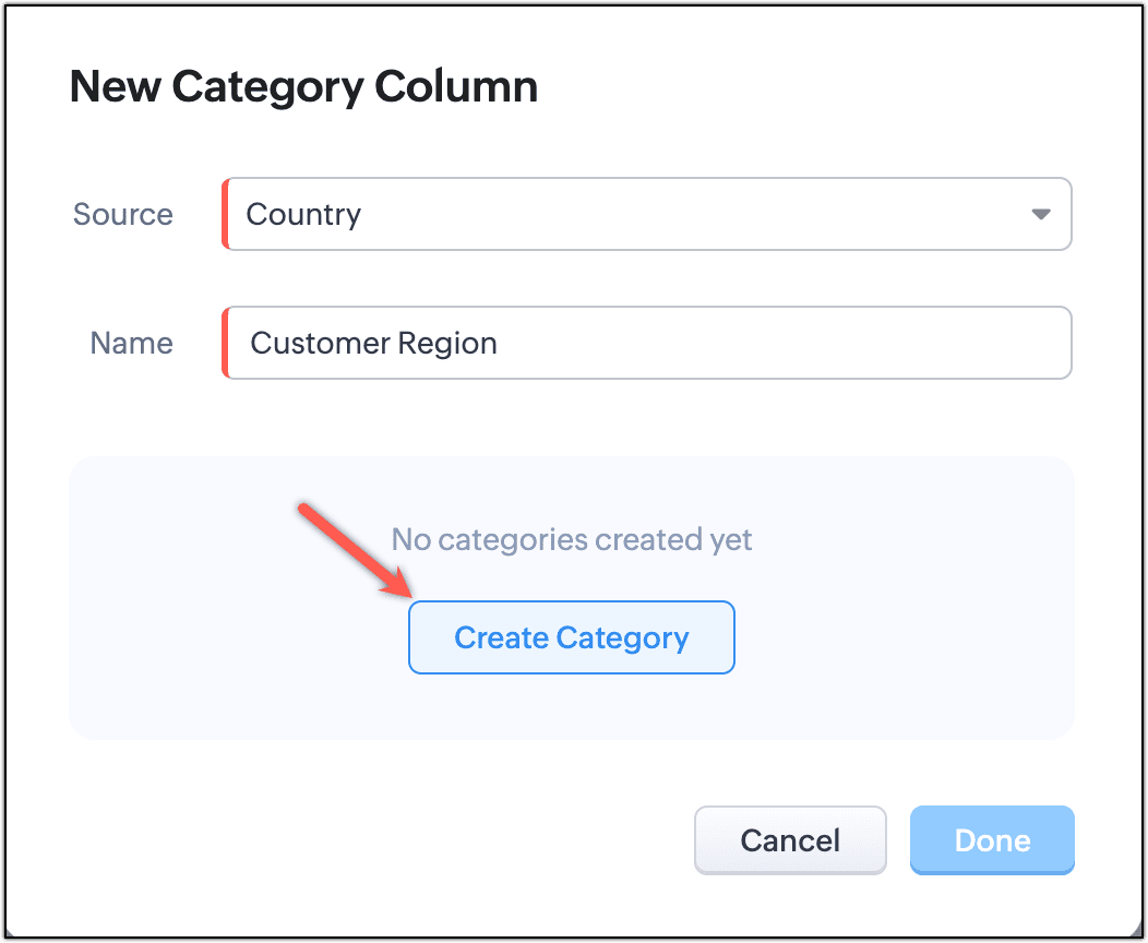 - Inserire il nome della nuova colonna di categoria. Cliccare Create Category. In questo esempio abbiamo inserito Customer Region come nome della colonna di categoria.