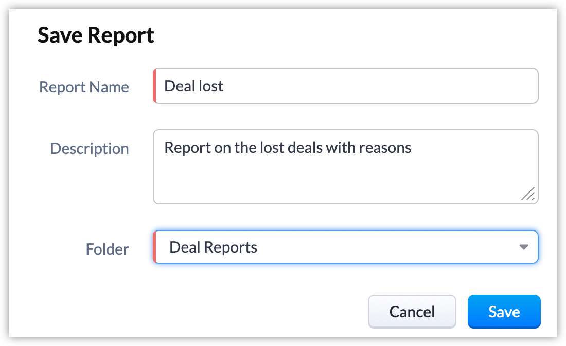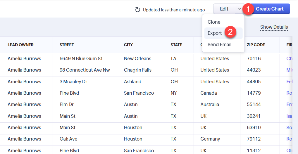 I report in Zoho CRM La aiutano a fare questo compilando i dati rilevanti per raggiungere obiettivi specifici, come un report mensile che traccia i lead appena acquisiti. Una volta creato, può condividere il report in diversi modi con chi ne ha bisogno.
