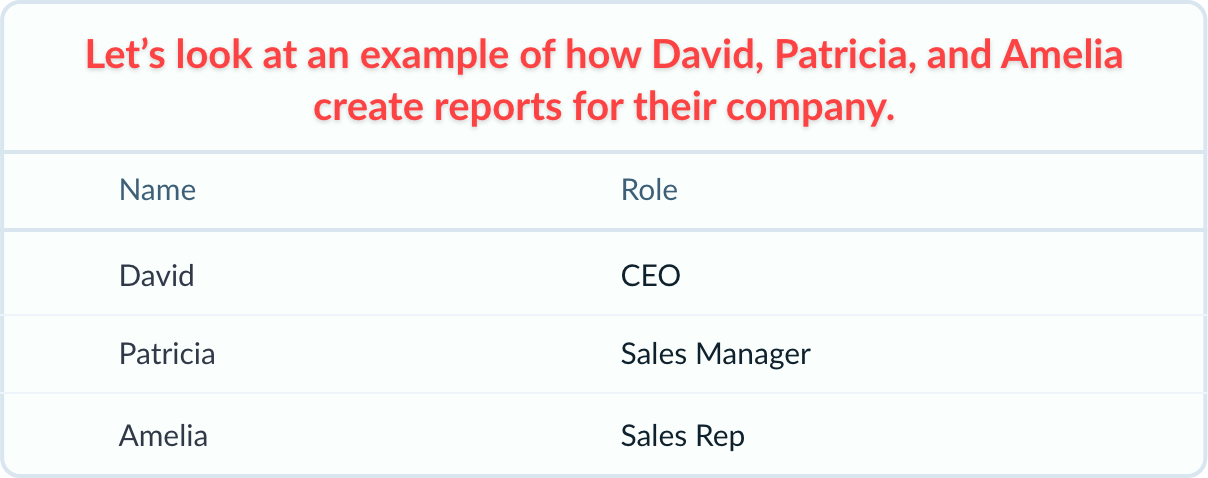Esistono due tipi di utenti che possono visualizzare i report: il proprietario del report, che lo ha creato, e gli utenti con cui il report è stato condiviso. Le autorizzazioni per creare, visualizzare e condividere i report si basano sul tipo di ruolo dell'utente.