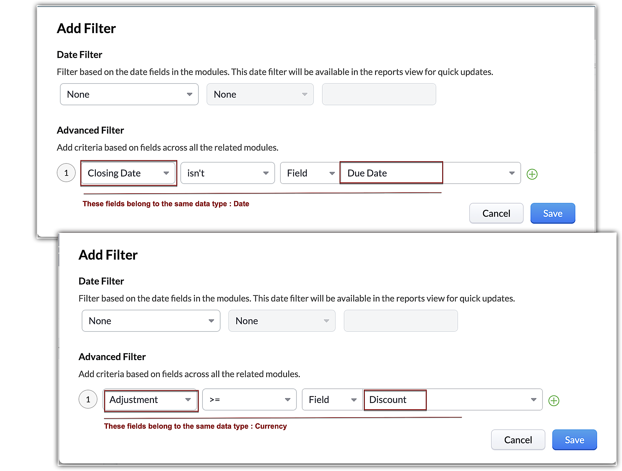 Se la multivaluta è abilitata nella Sua organizzazione, può utilizzare i campi dello stesso modulo per confrontare e filtrare. - Attualmente non è possibile utilizzare altri tipi di dati come elenchi a discesa o campi di ricerca per confrontare e qualificare.