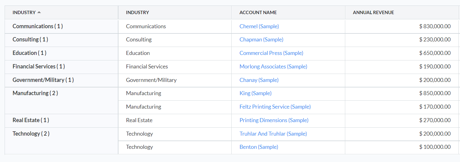 Il raggruppamento delle colonne viene utilizzato per creare un altro livello di raggruppamento all'interno dei gruppi di righe. Ad esempio, per categorizzare i record che sono già stati raggruppati per Settore in base al Fatturato annuale e al Tipo di account. Se utilizza entrambi i tipi di raggruppamento, i dati verranno visualizzati in formato griglia con etichette sia per righe che per colonne, noto anche come report a matrice.