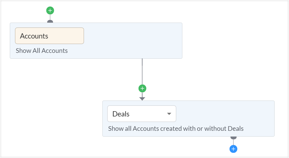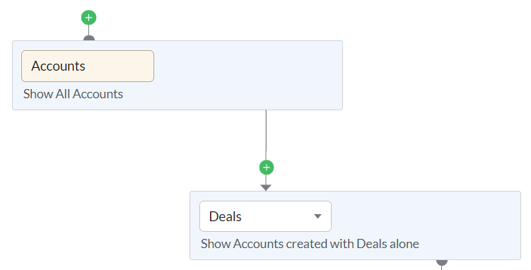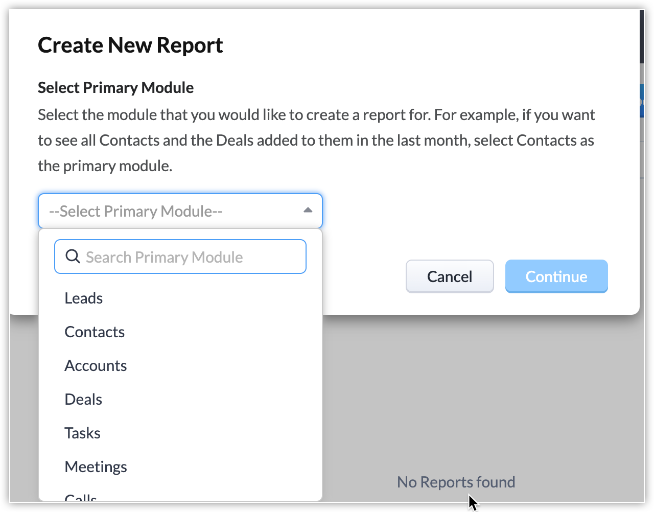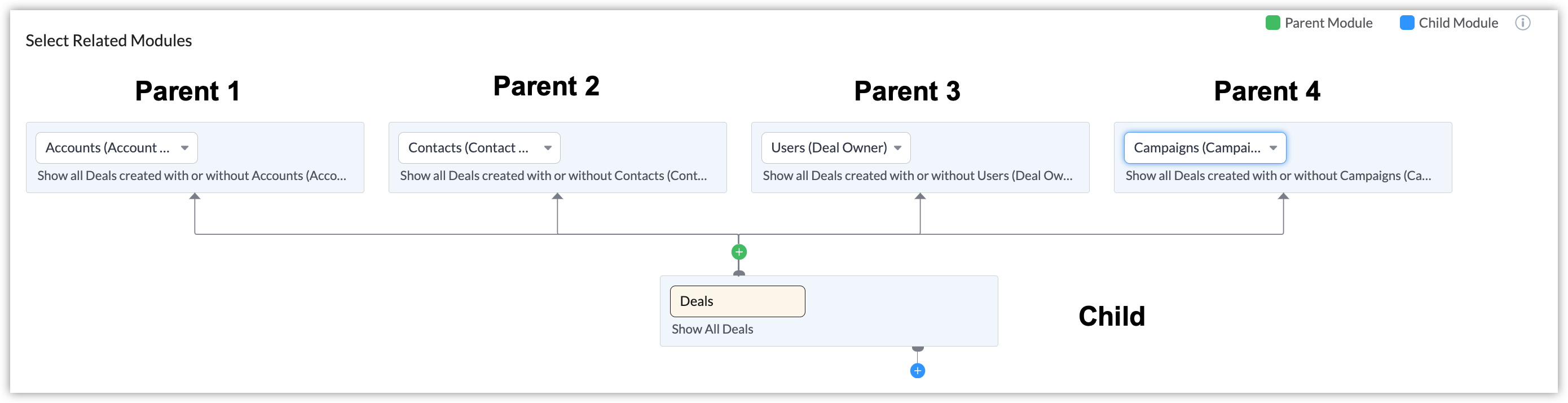 Quando crea un report, può aggiungere sia moduli padre che moduli figlio al modulo principale. L'elenco padre mostra tutti i campi di ricerca di un modulo, mentre l'elenco figlio mostra tutti gli elenchi correlati. Ad esempio, se sceglie Trattative come modulo principale, solo i moduli collegati ad esso tramite elenchi correlati saranno elencati come moduli figlio.