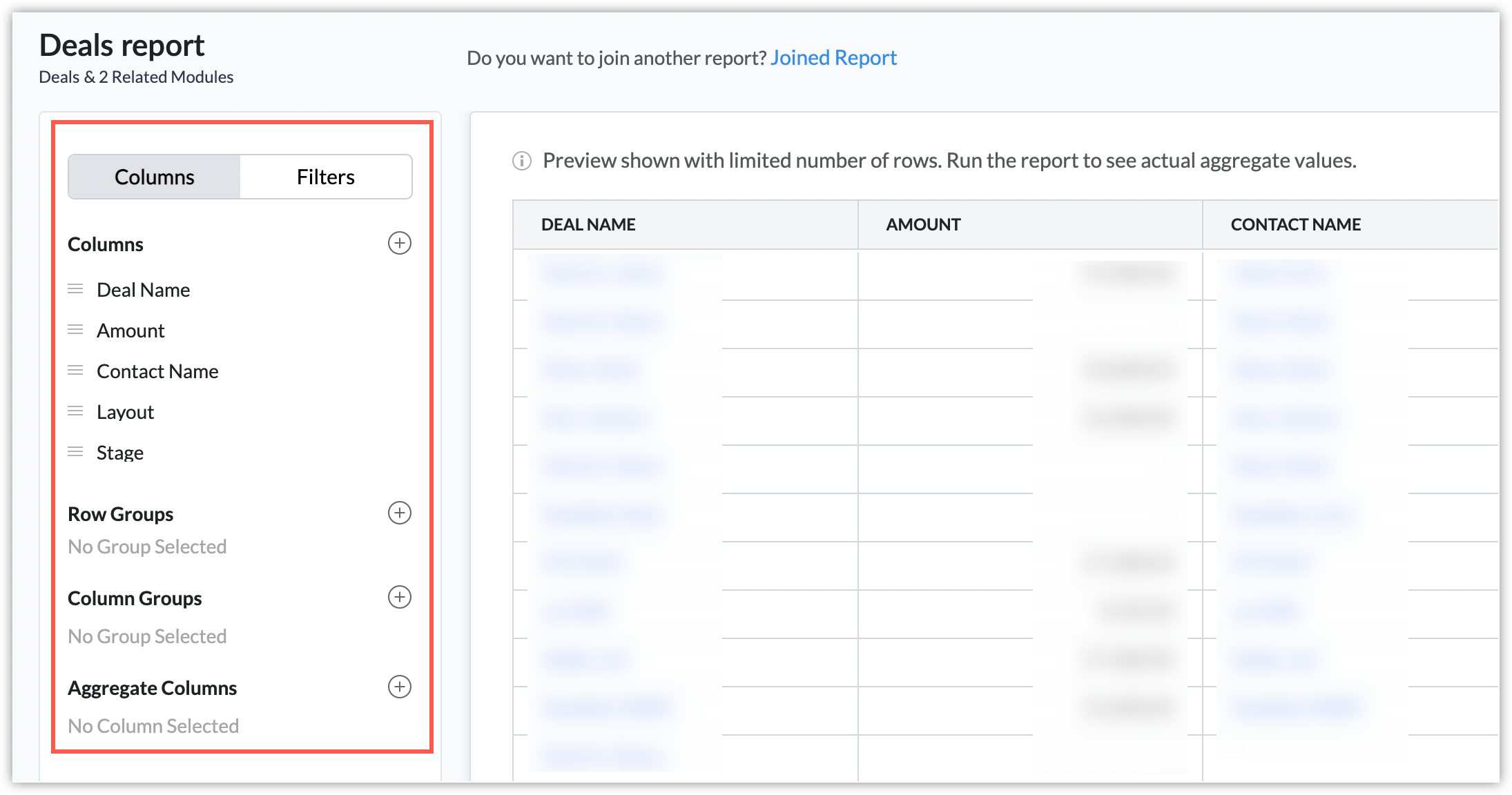 Quando crea un report, può personalizzare il modo in cui i dati vengono presentati raggruppando o aggregando colonne e righe, filtrando i dati e mostrando o nascondendo i campi. Questo La aiuta a visualizzare esattamente le informazioni necessarie per analizzare quanto è vicino al raggiungimento dei Suoi obiettivi aziendali.