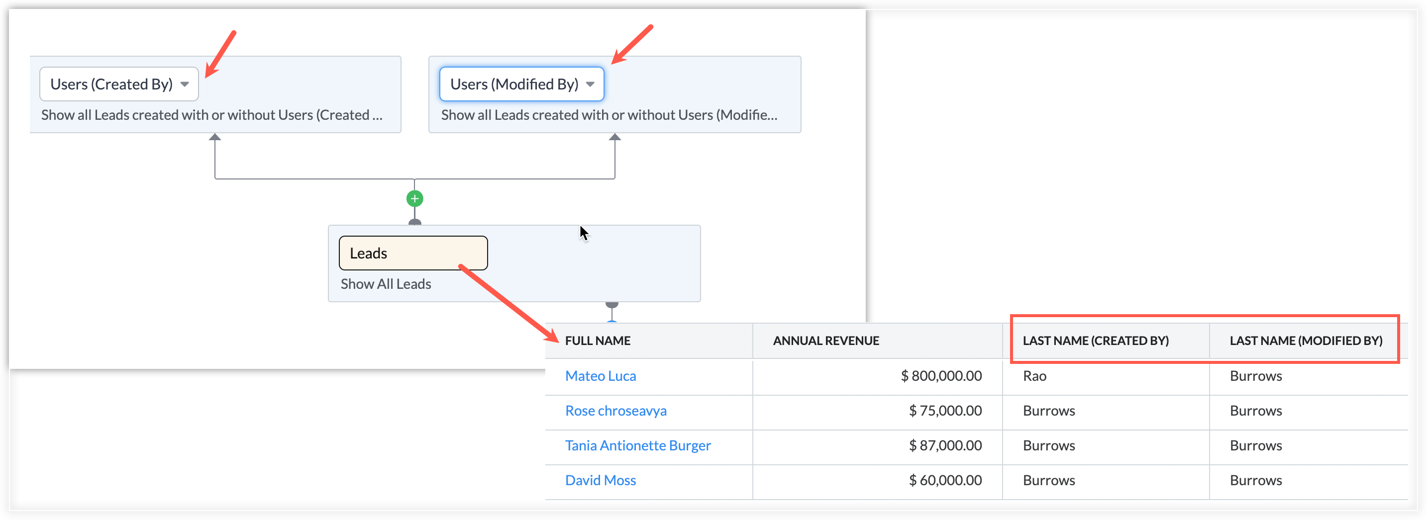 Se desidera creare un report che offra approfondimenti più complessi sul modulo principale, può aggiungere più moduli padre. Ad esempio, Utenti (Creato da) e Utenti (Proprietario lead) possono essere aggiunti come moduli padre per il modulo Lead per visualizzare quali utenti CRM hanno lavorato su ciascun lead.