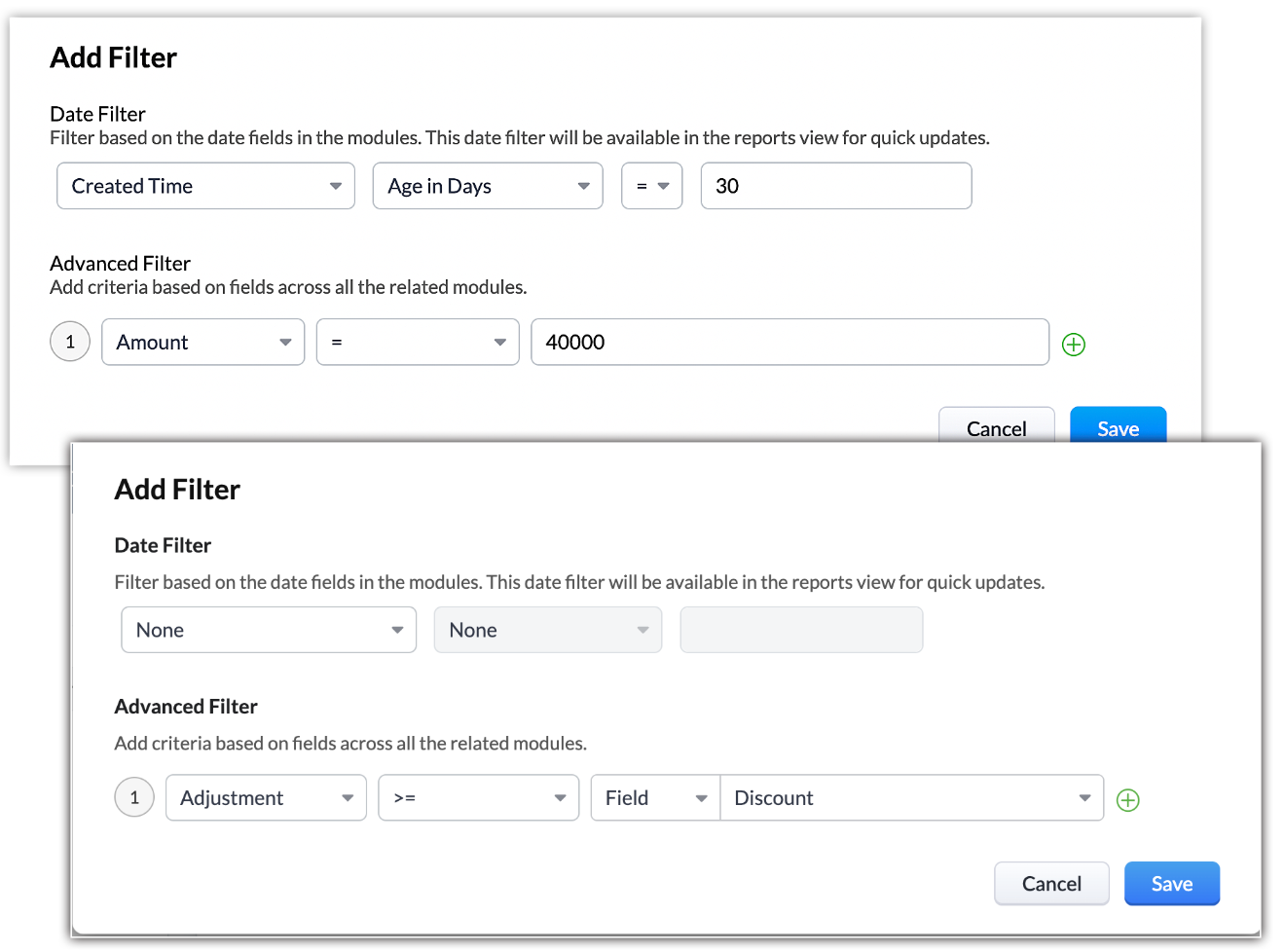 - Creare filtri avanzati utilizzando anche altri campi. Definisca i criteri che i record devono soddisfare per essere inclusi nel report.
