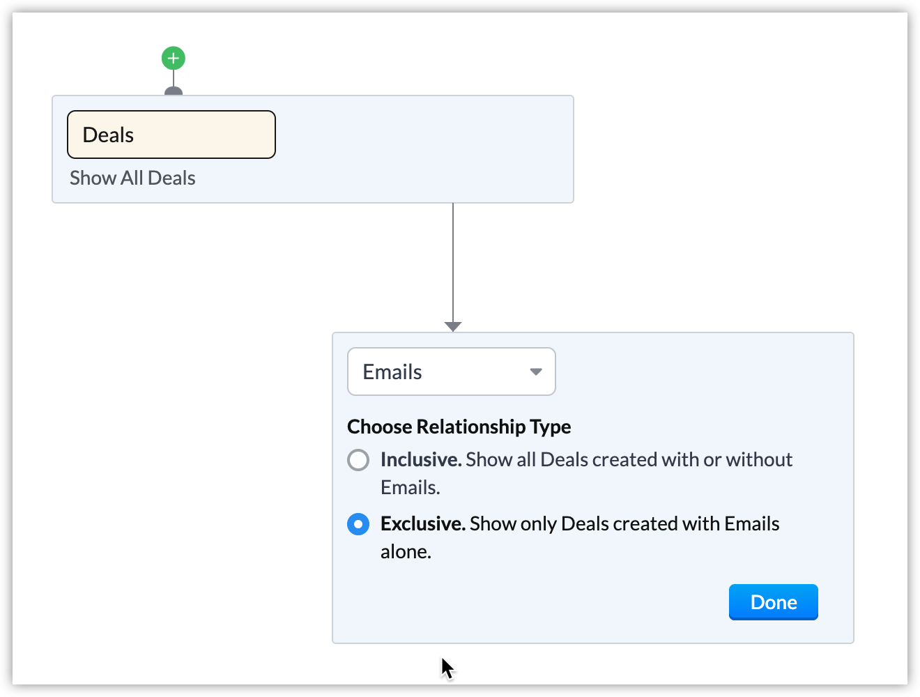 Quando sceglie un modulo figlio per un report, può scegliere se desidera che abbia una relazione esclusiva o inclusiva con il suo modulo padre. Questo Le consente di controllare quali dati vengono mostrati nel Suo report.