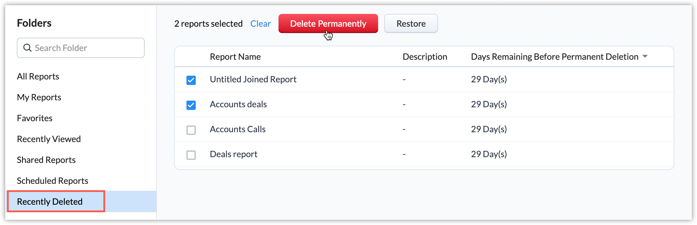 Può eliminare i report che non utilizza più. I report eliminati appariranno nell'elenco Eliminati di recente per 30 giorni, dopodiché verranno eliminati definitivamente. Può anche scegliere di ripristinarli dall'elenco Eliminati di recente o eliminarli definitivamente prima che siano trascorsi i 30 giorni.