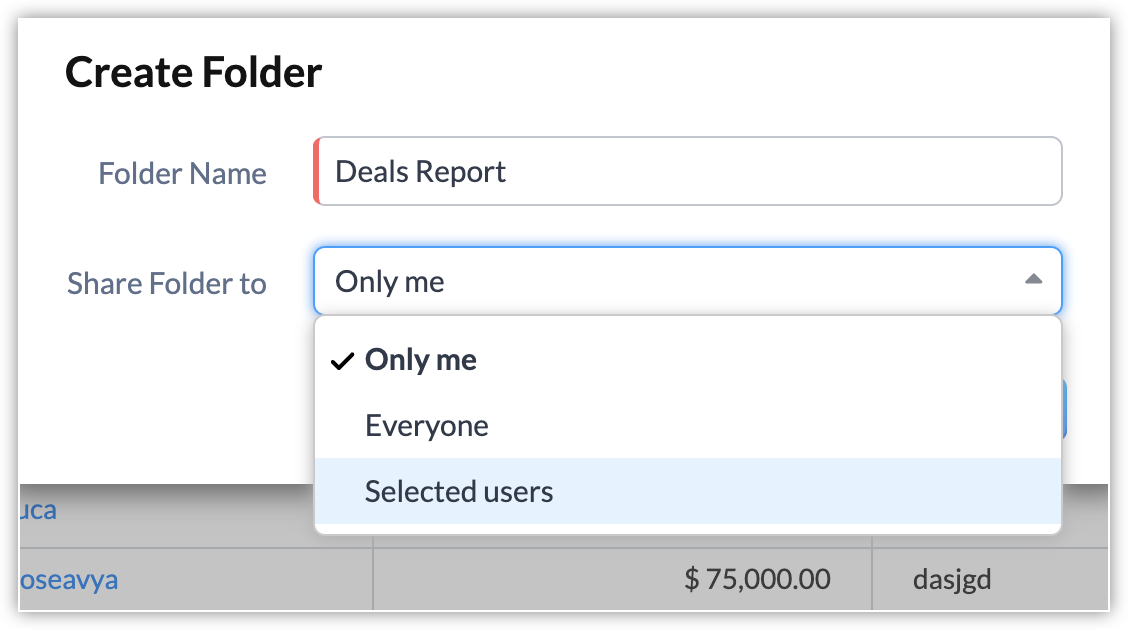 Faccia clic su Condividi e imposti l'autorizzazione su Tutti, Solo io o Utenti selezionati nel popup Condividi cartella. Se sceglie Utenti selezionati, selezioni singoli utenti con cui condividere il report oppure selezioni gruppi, ruoli o ruoli e i loro subordinati con cui condividere il report. Quando condivide le cartelle con gli utenti, appariranno automaticamente nell'elenco nel loro modulo Report.