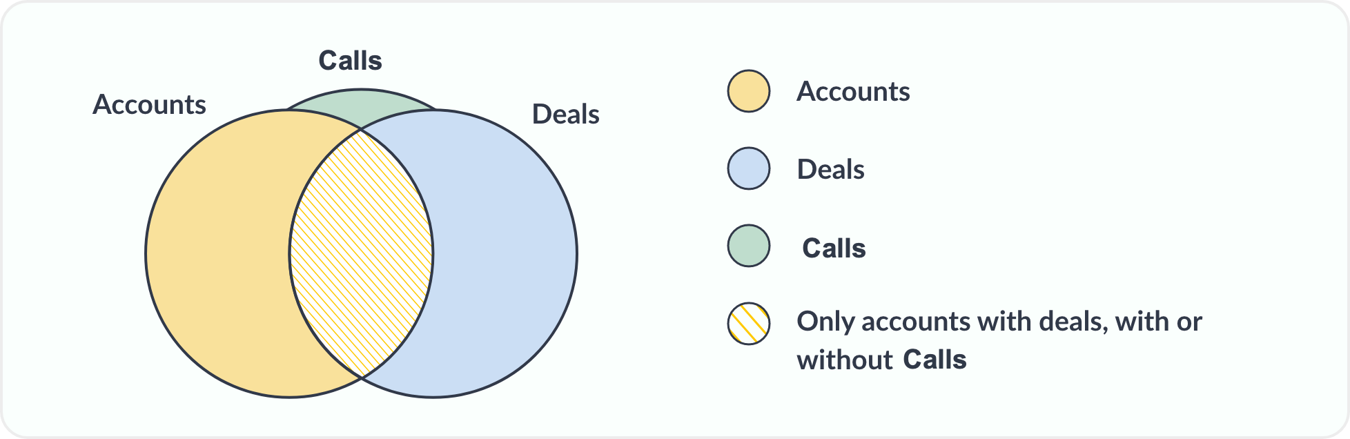 Inclusiva: Una relazione inclusiva mostrerà tutti i record nel modulo padre, indipendentemente dal fatto che abbiano dati correlati nel modulo figlio. Ad esempio, potrebbe creare un report che visualizza tutti gli account, indipendentemente dal fatto che abbiano trattative associate.