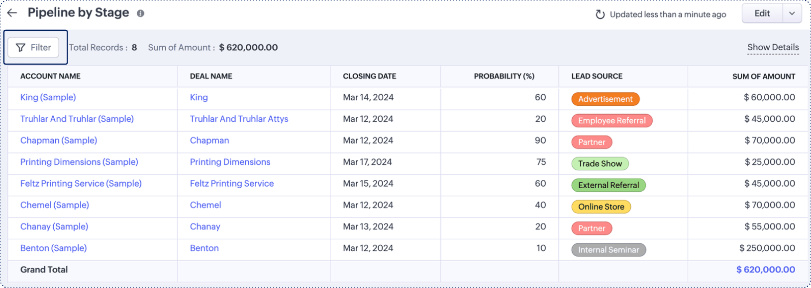 Potrebbe non aver bisogno di tutti i dati nel Suo CRM per il report. Ad esempio, potrebbe voler visualizzare solo le informazioni sui lead creati negli ultimi 30 giorni. Può aggiungere un filtro al report per limitare i dati visualizzati.