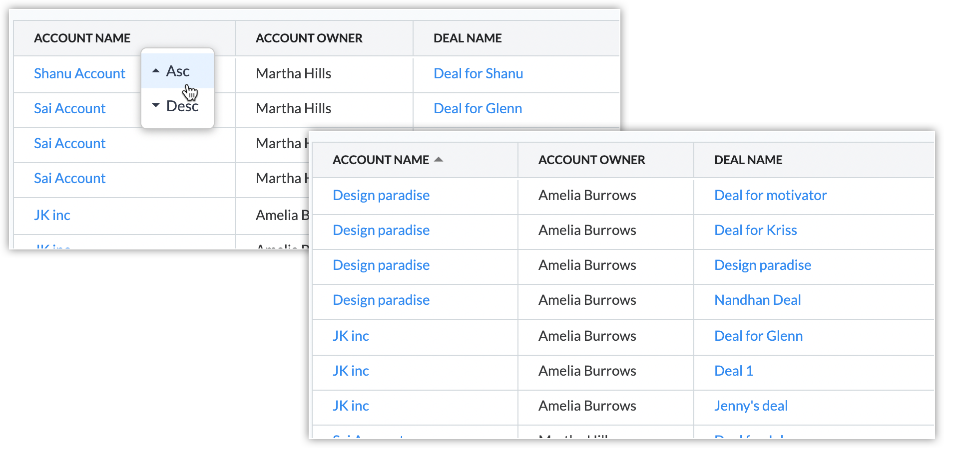 Ad esempio, la colonna Tipo account è ordinata in ordine crescente.