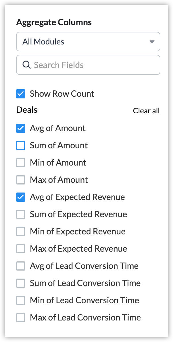 Aggiunga o elimini colonne dal report utilizzando le caselle di controllo. Può scorrere l'elenco o utilizzare il campo Cerca campi per cercare un campo specifico che desidera aggiungere o rimuovere come colonna. Faccia clic su Deseleziona tutto per deselezionare tutte le caselle di controllo.