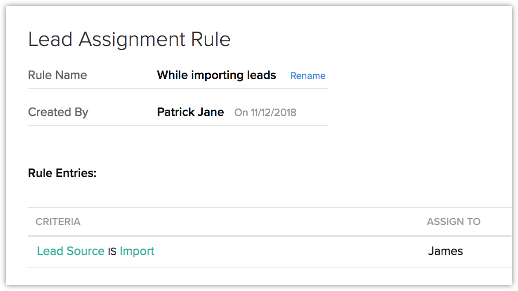 Le regole di assegnazione Le consentono di assegnare automaticamente i record a un utente. Supponiamo che Lei abbia 2.500 lead da importare e voglia assegnarli tutti a James, un utente nel Suo account CRM. Può farlo facilmente utilizzando le regole di assegnazione.