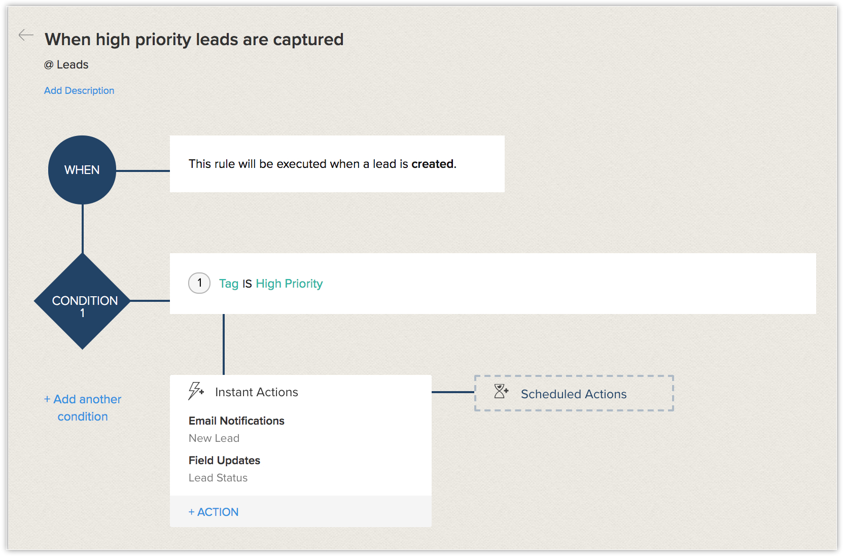 Crei una regola del flusso di lavoro in Zoho CRM in modo che quando un lead viene creato e contrassegnato come Alta priorità, il responsabile associato verrà notificato immediatamente e il campo stato verrà aggiornato a Contattato. Questo avverrà automaticamente ogni volta che un lead ad alta priorità viene aggiunto all'account.