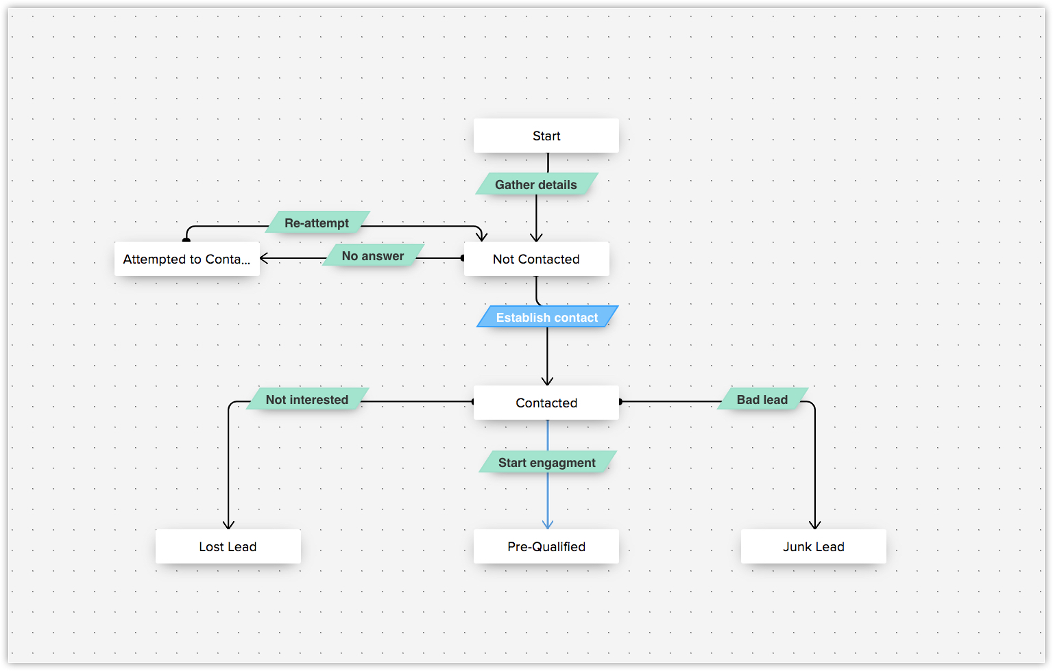 Consideriamo la coltivazione dei lead. Prima è necessario raccogliere i dettagli su un lead per aggiungerlo al Suo account, quindi stabilire un contatto. Quando cerca di stabilire un contatto, il Suo lead potrebbe non rispondere alla chiamata, nel qual caso dovrà riprovare il giorno successivo. Una volta stabilita con successo la comunicazione con il Suo lead, i possibili esiti possono essere: