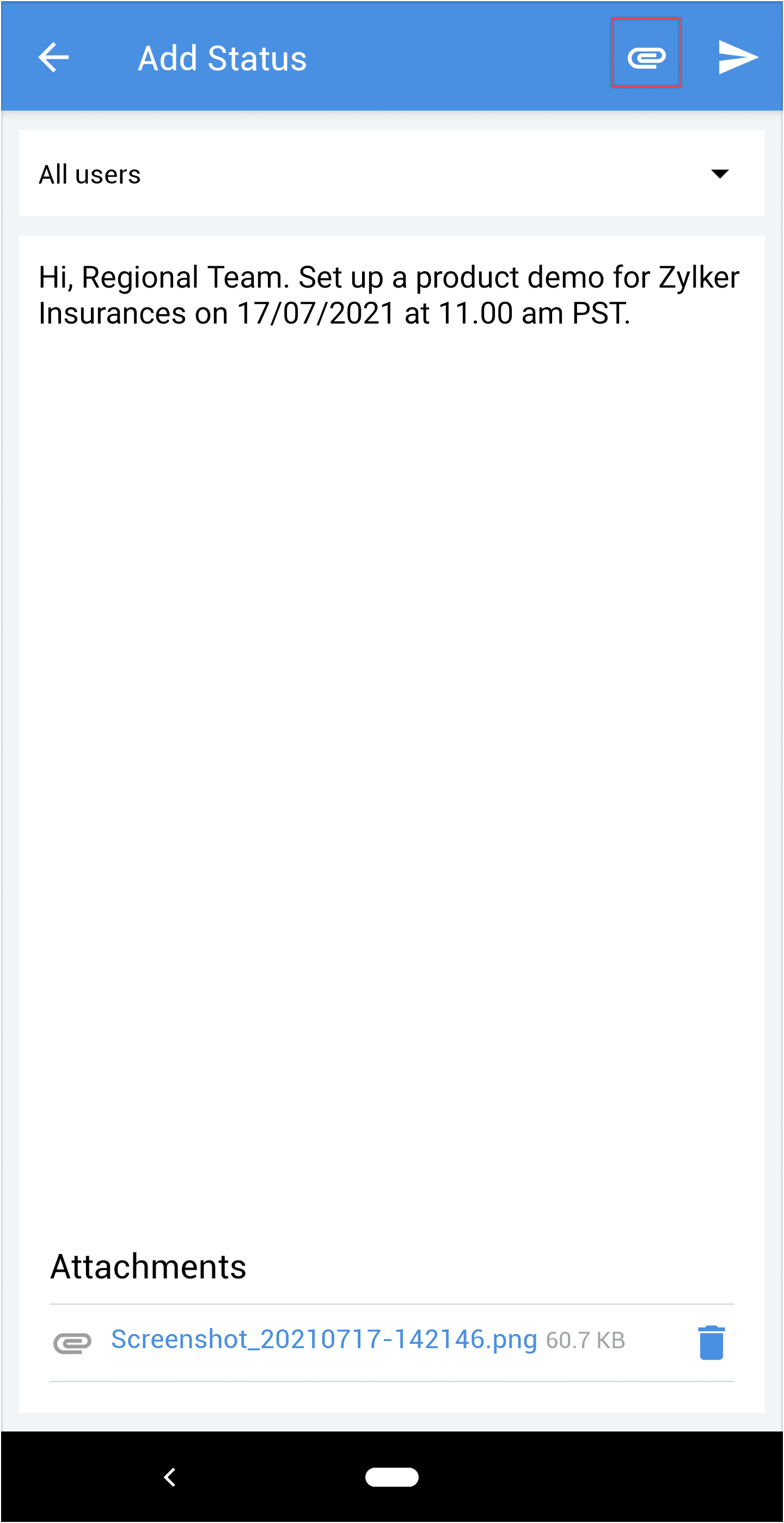 - Tocchi l'icona dell'allegato nell'angolo in alto a destra per caricare file.