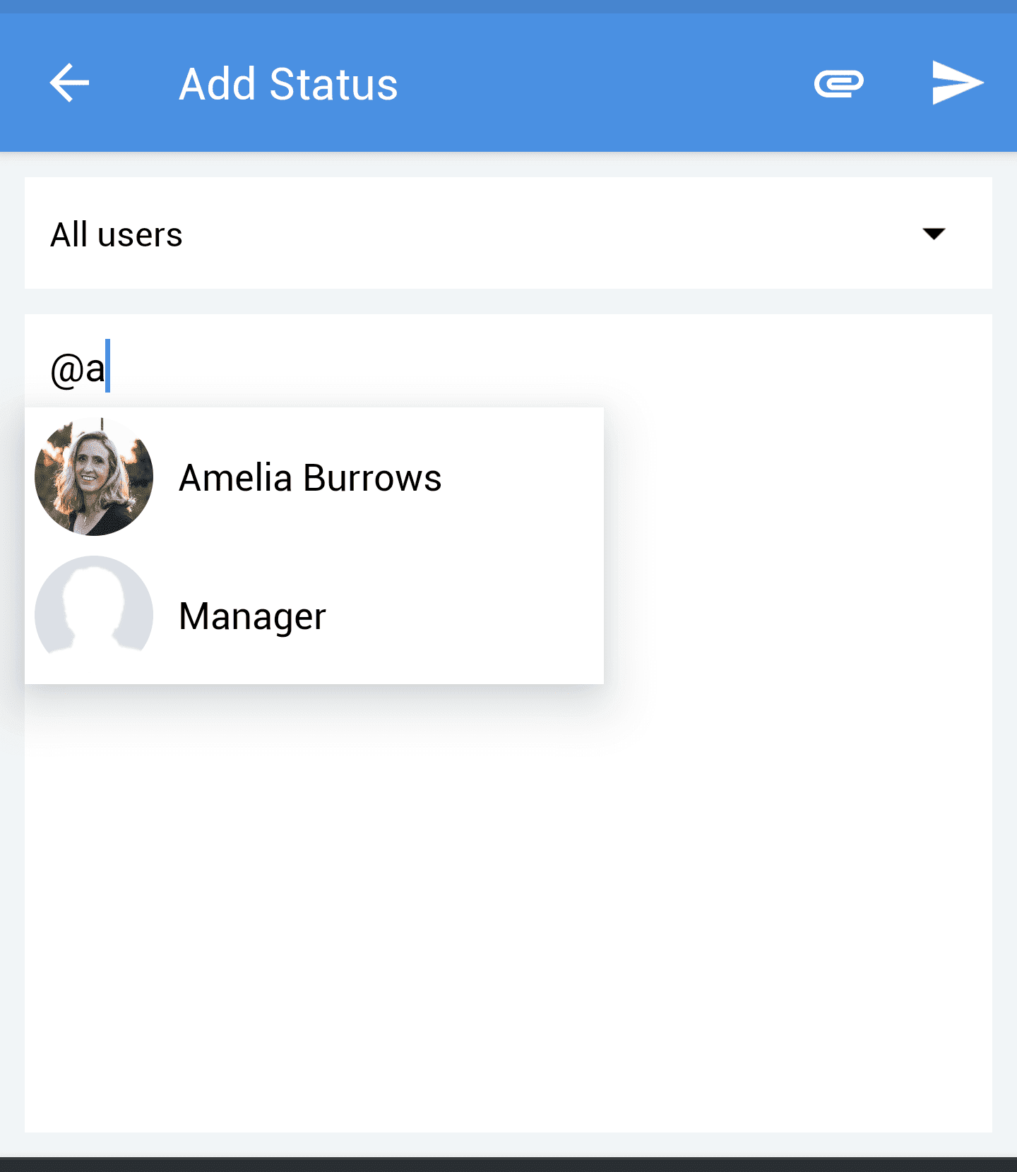- Per menzionare un utente, inserisca @ e digiti il nome utente. Scelga l'utente desiderato dall'elenco dei nomi.