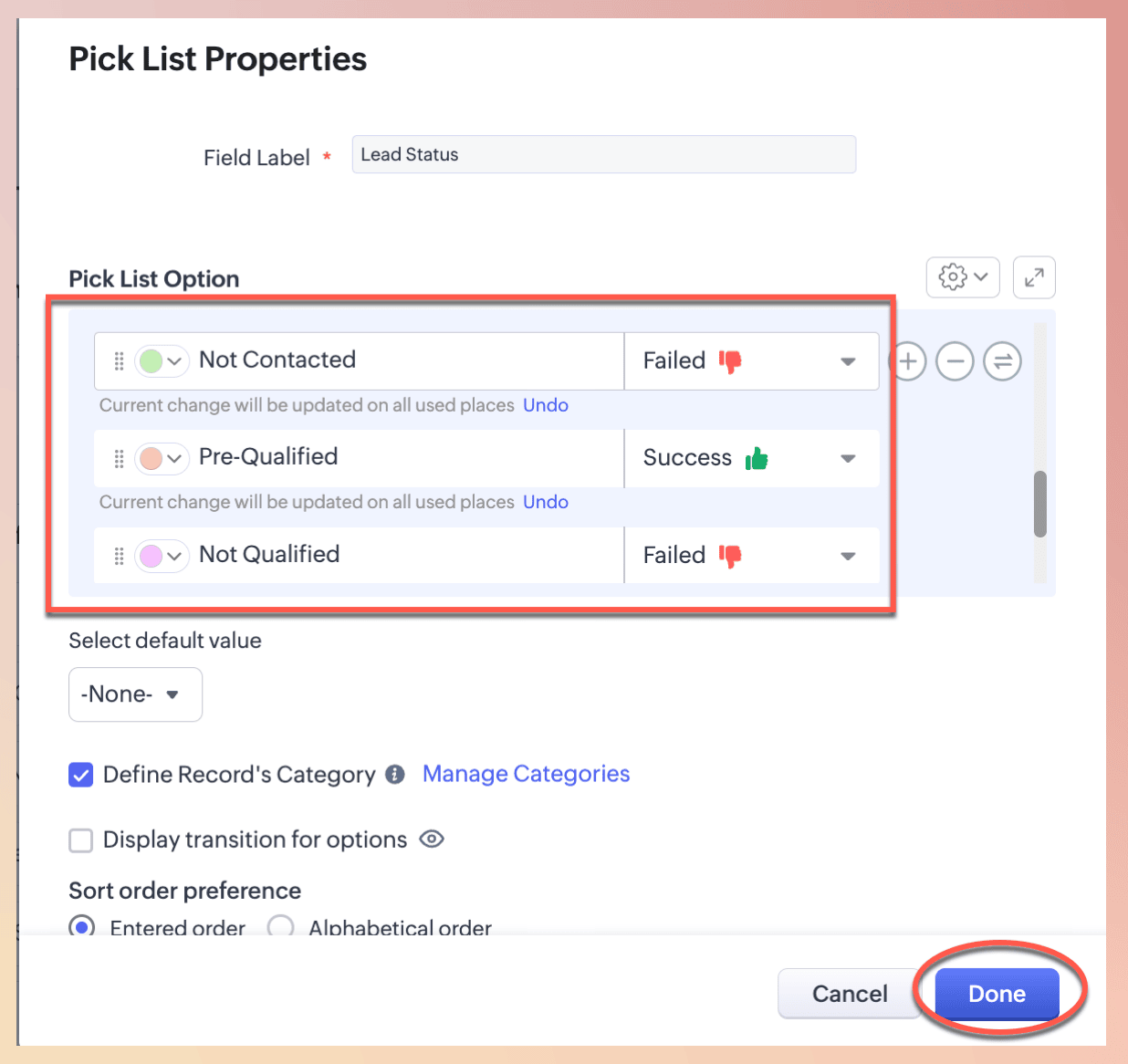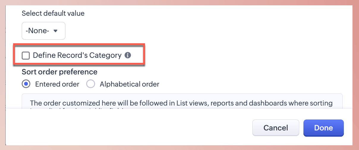 Nelle proprietà della lista di selezione, mappare ciascun valore della lista di selezione a una categoria di record pertinente.