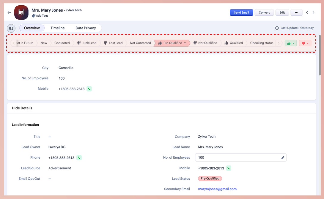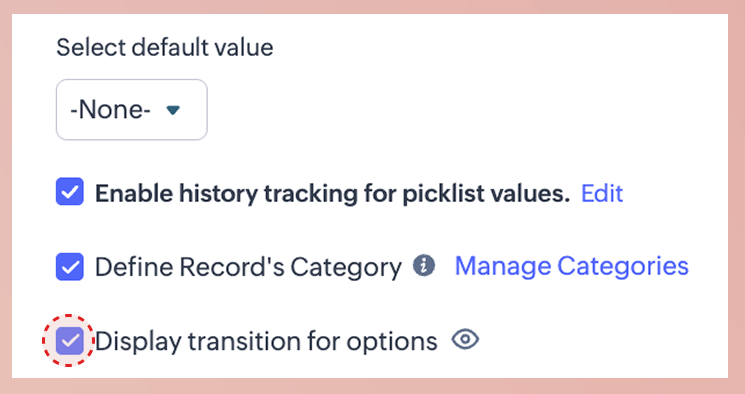 Per ottenere una visione d'insieme del progresso del record nella pagina dei dettagli del record, abilitare Display Transition for options.