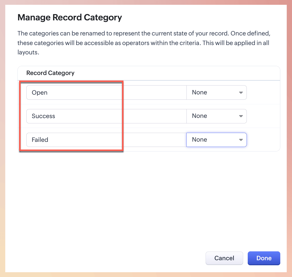Utilizzare le categorie di record predefinite (Success, Failed, Open/Other), oppure