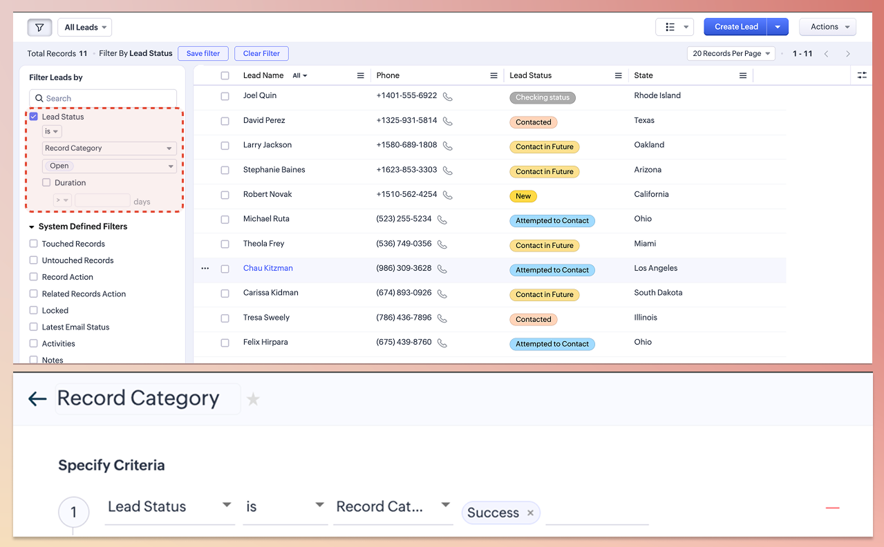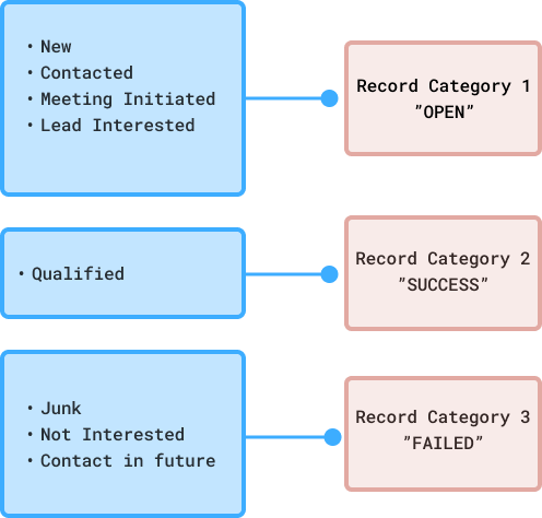 Una categoria di record è una classificazione di alto livello che rappresenta lo stato complessivo di un record raggruppando i valori correlati delle liste di selezione in categorie più ampie e significative. Aiuta a riassumere la posizione di un record senza fare affidamento su fasi individuali o dettagliate.