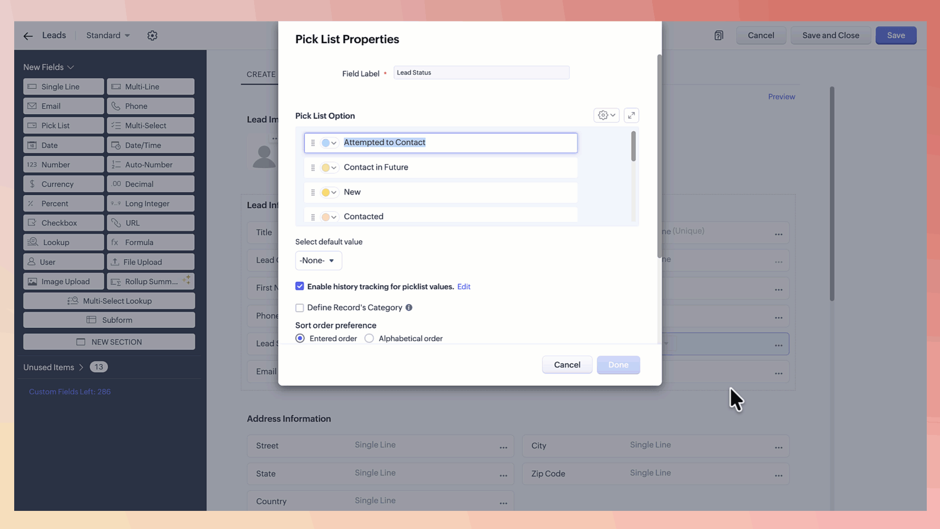 Navigare al modulo desiderato > Creare/modificare un campo lista di selezione.