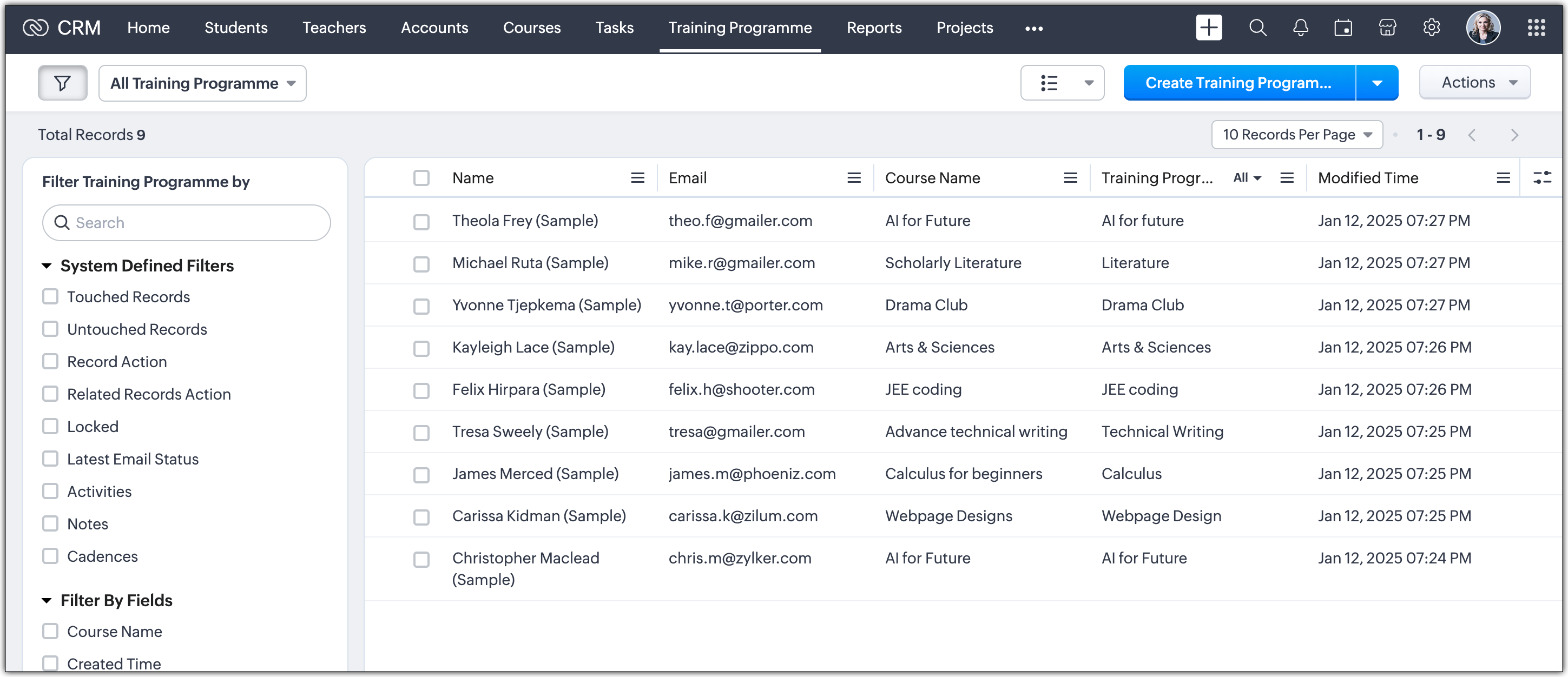 4. Istituzioni Educative: Utilizzare un modulo personalizzato per gestire processi legati all'istruzione come programmi di formazione, progressi degli studenti e feedback sui corsi. Highland School of Business Management, che utilizza Zoho CRM per le proprie operazioni educative, può trarre grande beneficio da questa funzionalità. Creando moduli personalizzati, possono ottimizzare i processi relativi a insegnanti, studenti, corsi e programmi di formazione. Ad esempio, possono mantenere registri organizzati per il proprio elenco di insegnanti, studenti e corsi. Inoltre, i moduli personalizzati consentono loro di pianificare, organizzare e tracciare in modo efficiente i programmi di formazione sia per studenti che per insegnanti, garantendo una gestione fluida delle iniziative educative.