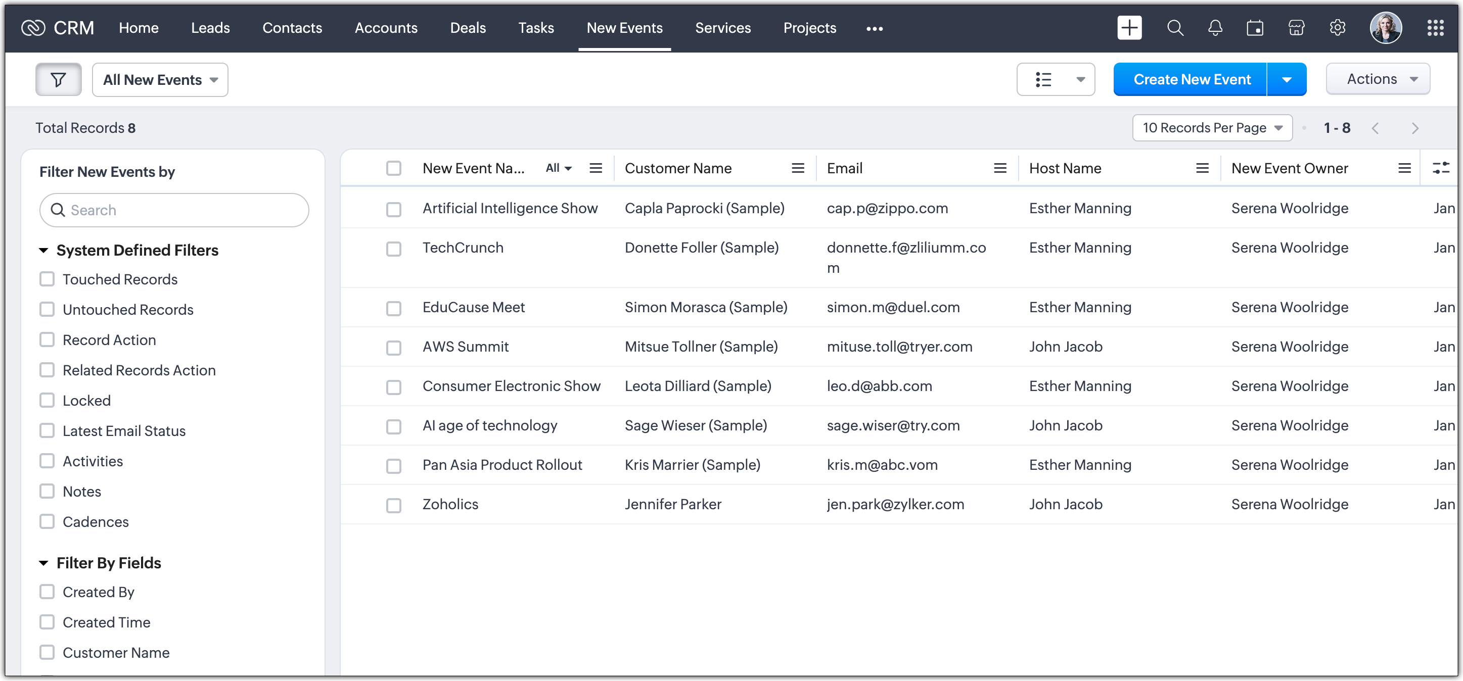 3. Gestione Eventi: Sviluppare un modulo per pianificare e tracciare eventi, inclusi partecipanti, programmi e risultati. Ad esempio, Sun Media House, con sede in California, serve clienti di diversa provenienza aiutandoli a organizzare eventi per varie occasioni. Si affidano a Zoho CRM per gestire le relazioni con i clienti in modo efficiente. Con eventi programmati durante tutto l'anno, è fondamentale per loro assicurare che ogni evento sia ben pianificato e realizzato senza intoppi. Creando un modulo personalizzato chiamato "Nuovi Eventi", possono tracciare l'avanzamento della pianificazione degli eventi, incluse programmazione, registrazioni e dettagli degli organizzatori, garantendo una gestione degli eventi fluida.