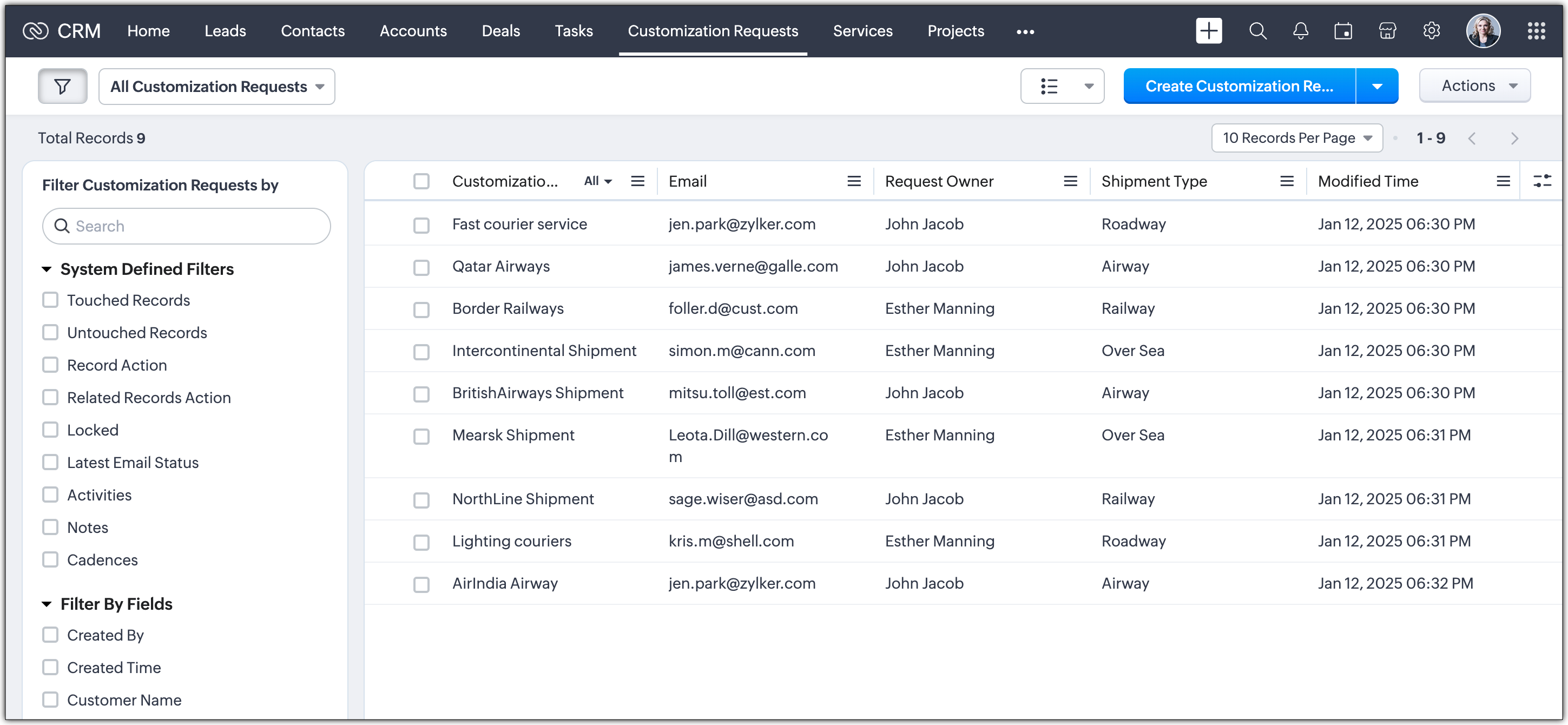 1. Richieste di Personalizzazione Prodotto: Creare un modulo per tracciare e gestire le richieste dei clienti relative a modifiche del prodotto. Ad esempio, ZylkerInc, una start-up specializzata in software di tracciamento per il settore delle spedizioni, utilizza il CRM per gestire la propria attività. Per soddisfare le esigenze uniche dei propri clienti in base alle modalità di trasporto - come strada, aereo, mare o ferrovia - possono personalizzare il proprio software di conseguenza. Creando un modulo personalizzato intitolato "Richieste di Personalizzazione", possono tracciare e gestire in modo efficiente i requisiti specifici di personalizzazione inviati dai propri clienti.