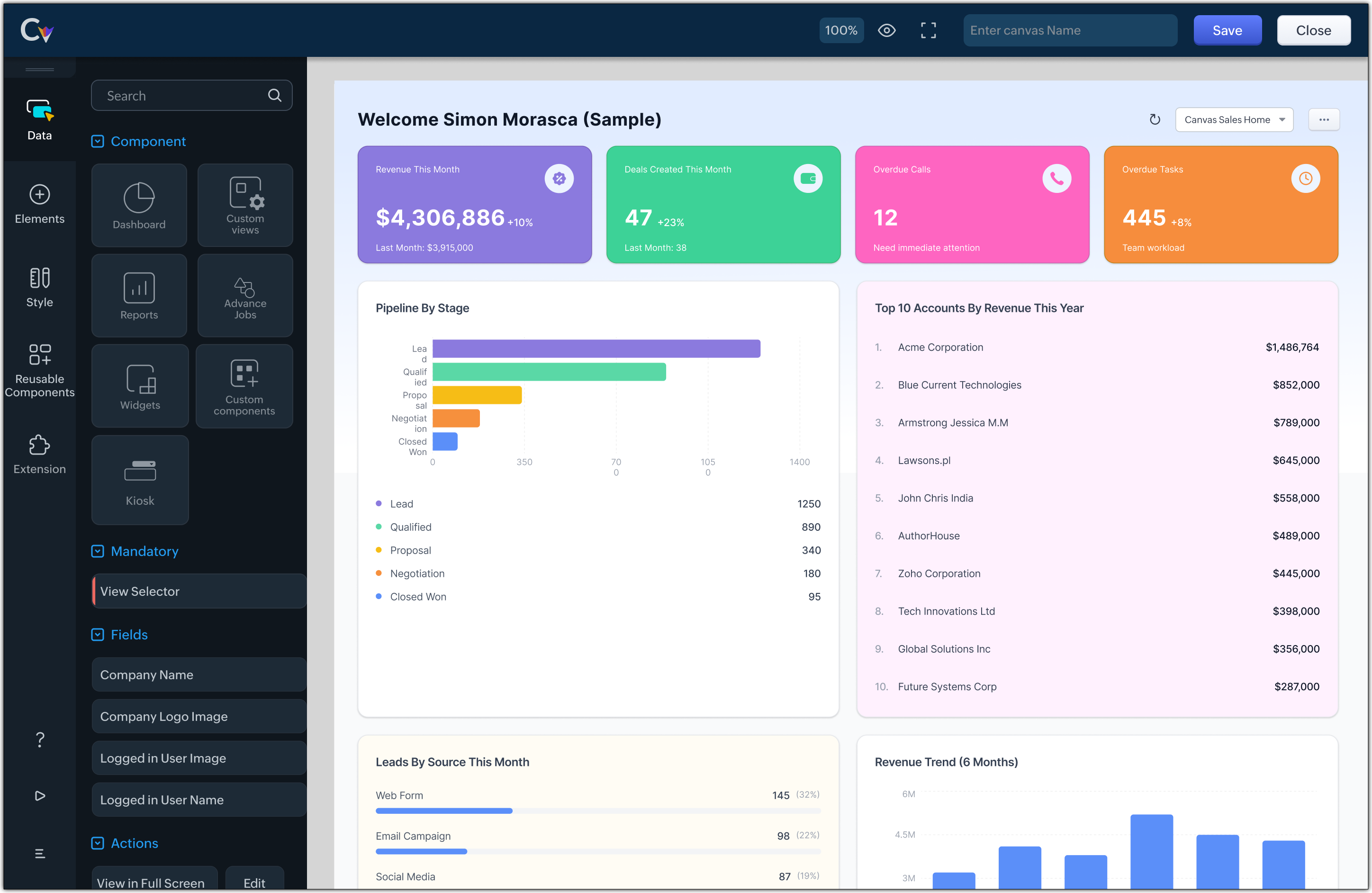 Canvas Home View supporta un insieme di componenti che aiutano a presentare i dati in modo chiaro e a compiere azioni rapide. È possibile utilizzare componenti come: