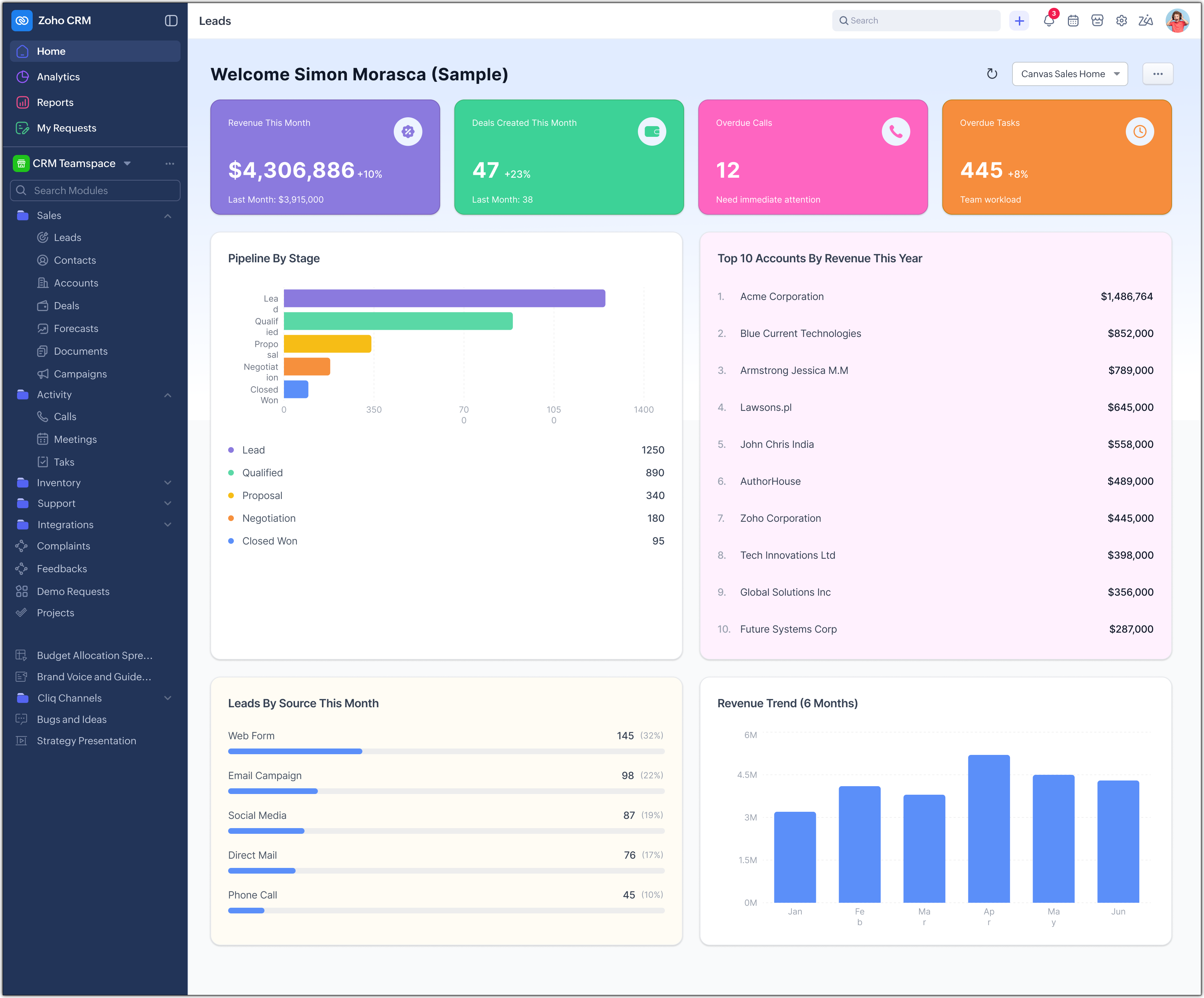 Canvas Home View è progettata per migliorare il modo in cui gli utenti interagiscono con Zoho CRM fin dal momento in cui effettuano l'accesso. Si concentra nel rendere la homepage più pertinente, basata sui ruoli e orientata all'azione.