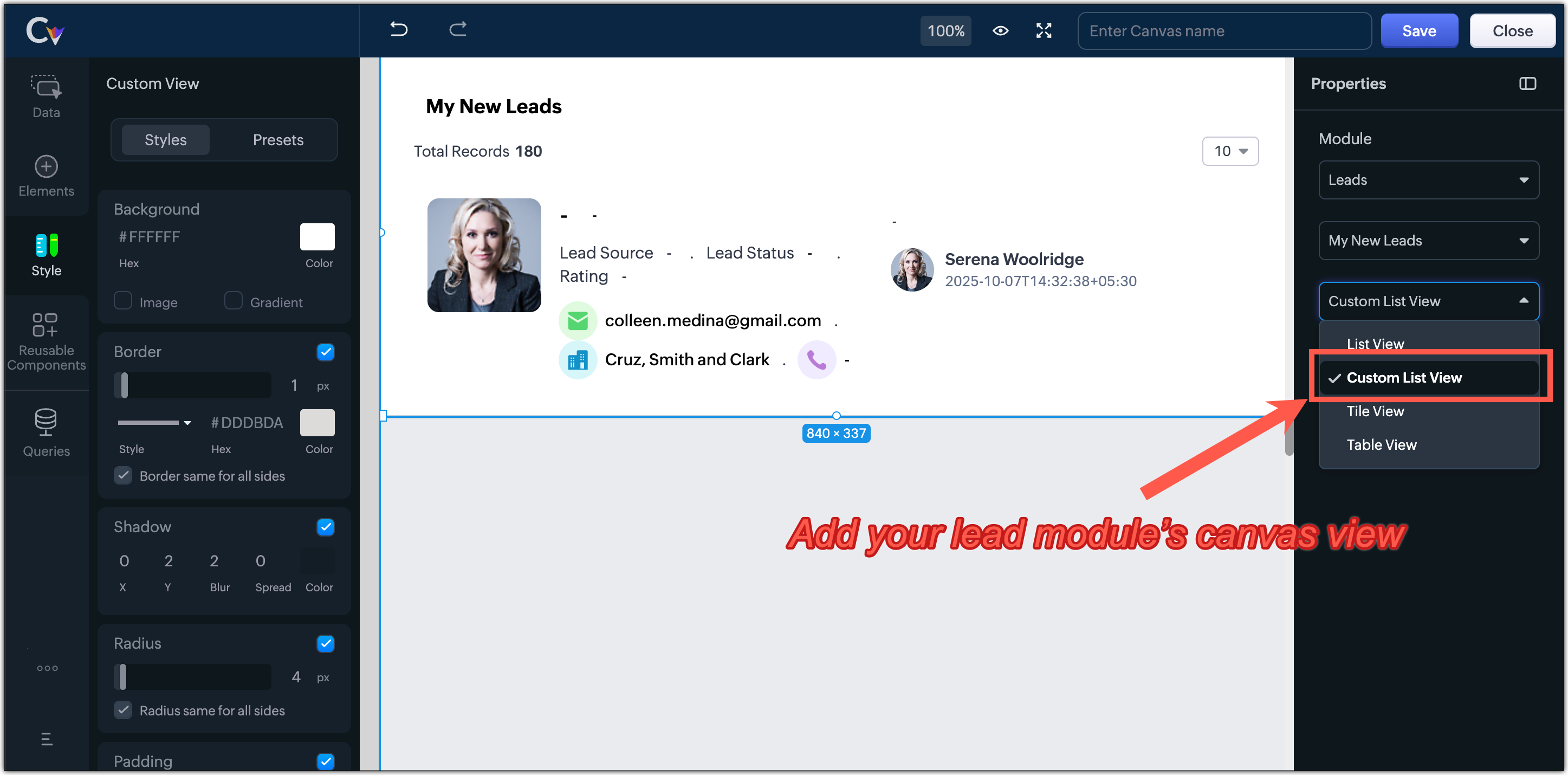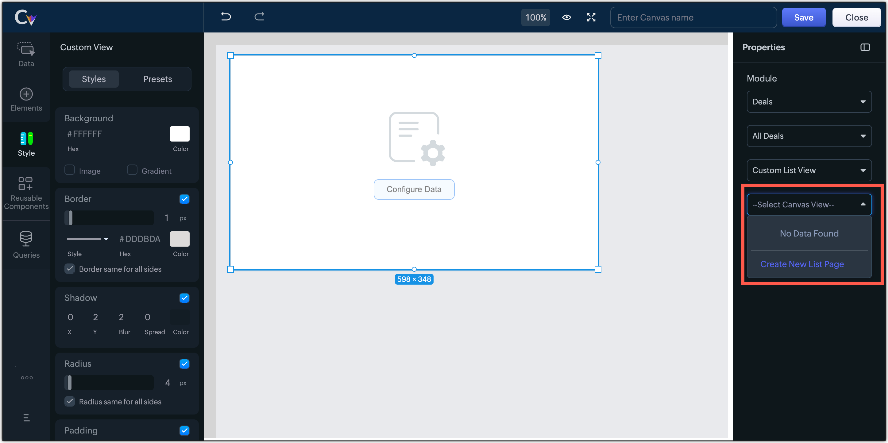 Se un modulo non dispone già di una vista elenco personalizzata, è possibile crearne una e poi aggiungerla alla Home View. Se non sono state create viste elenco in Canvas, è possibile selezionare Create New List Page dalla sezione proprietà del builder Canvas per incorporarle in qualsiasi componente della Home View.