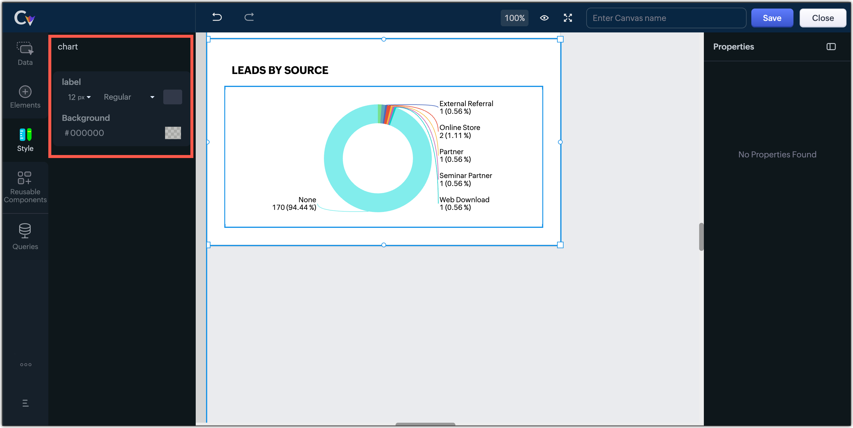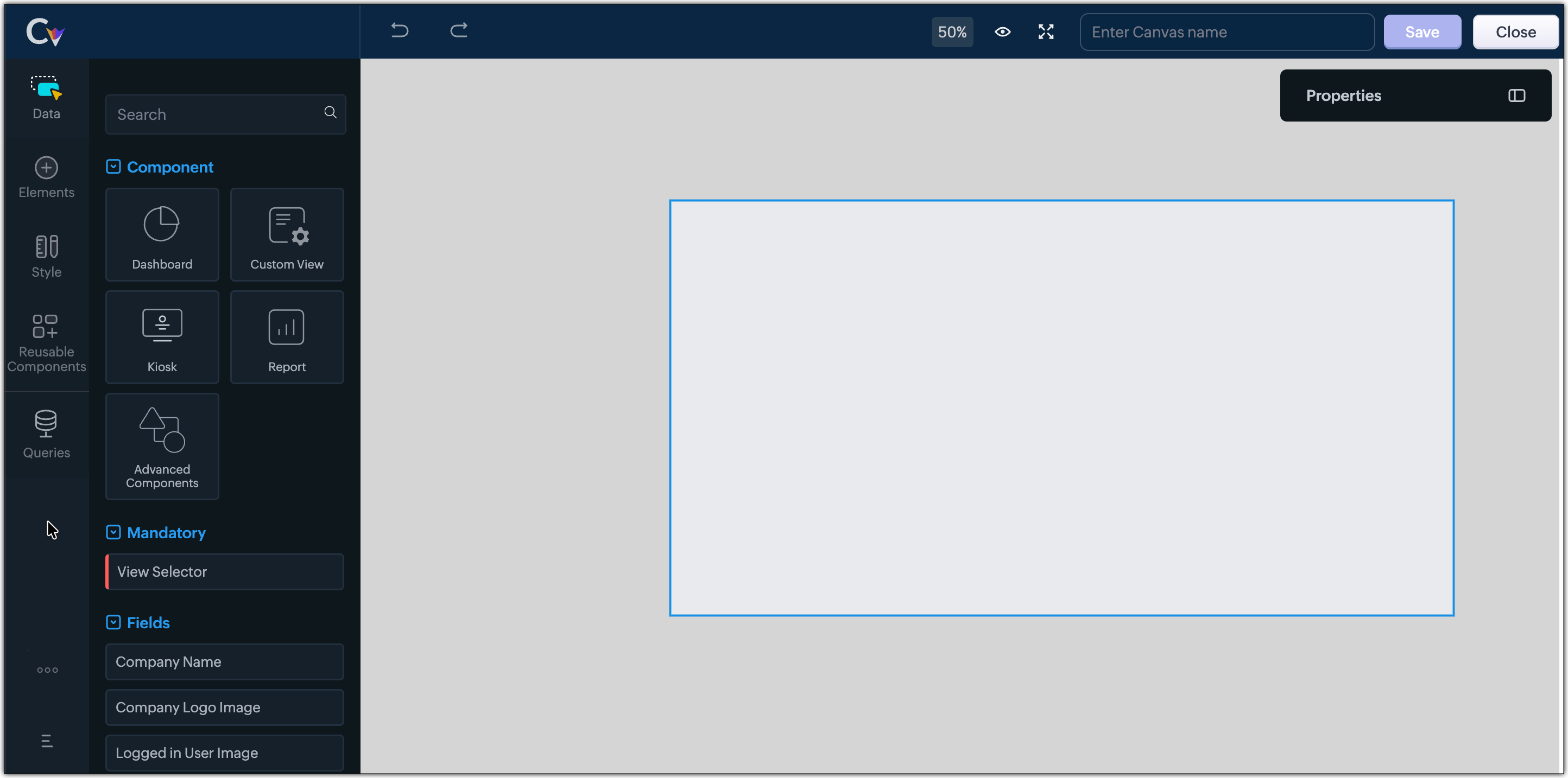 - Si apre il builder Canvas. Trascinare e rilasciare i componenti sul canvas.
