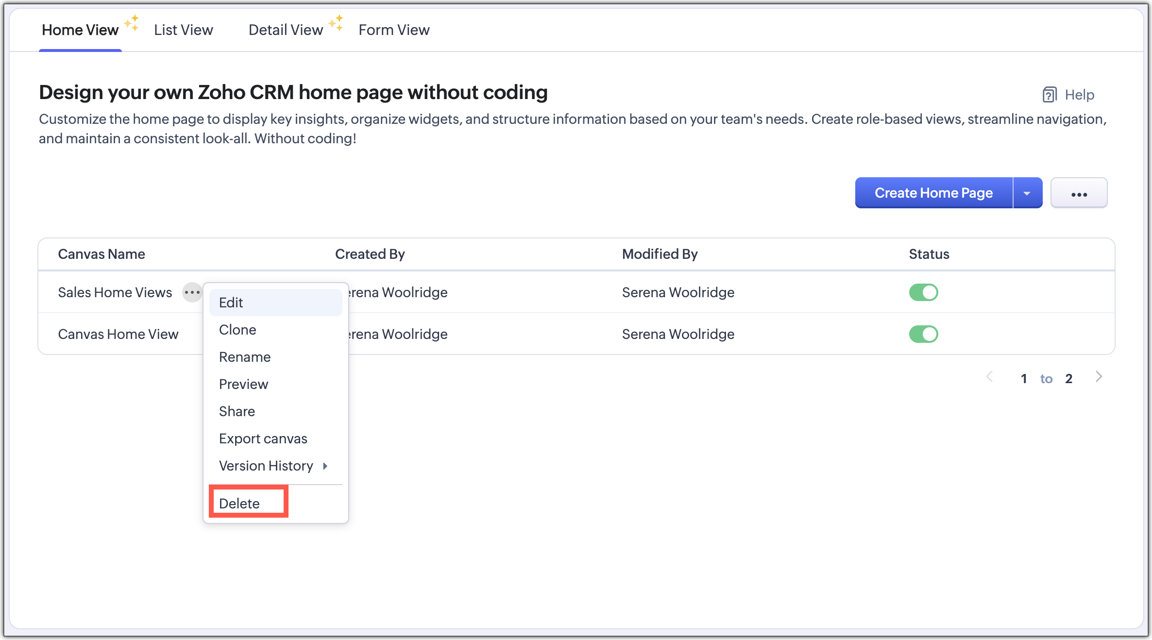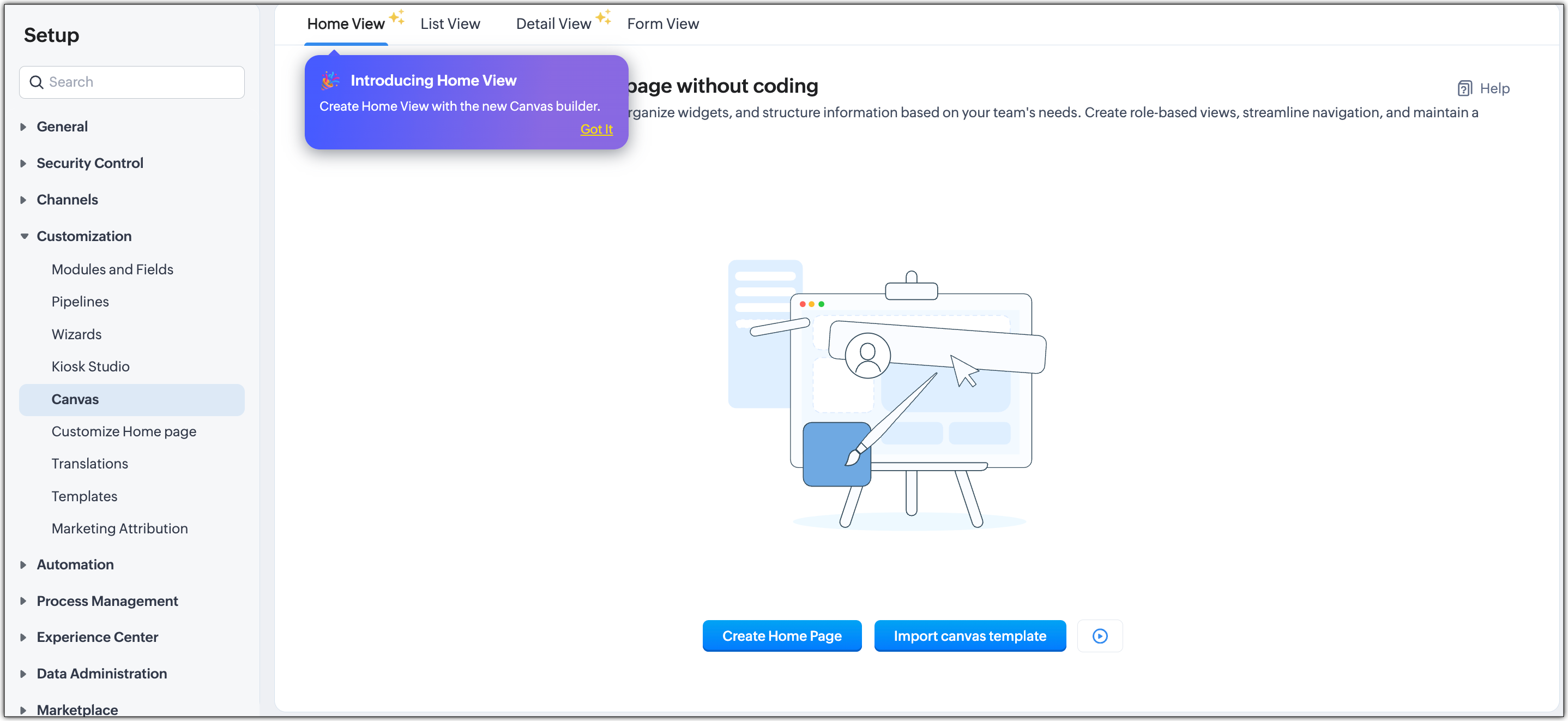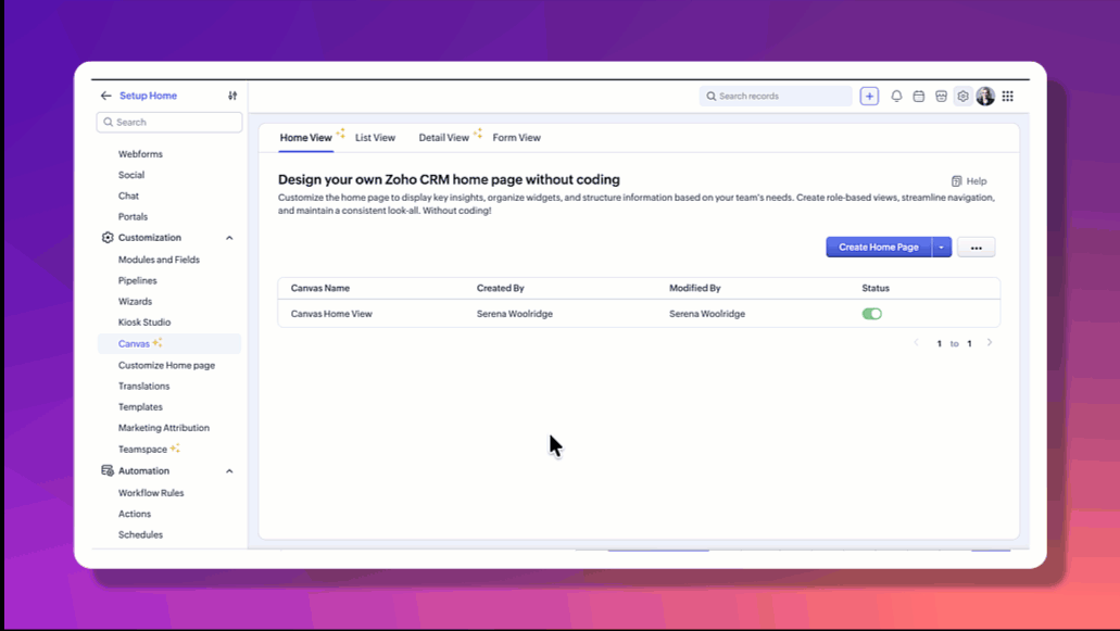 Canvas Home View si applica solo alla homepage del CRM e non influisce sui dati o sui record dei moduli.