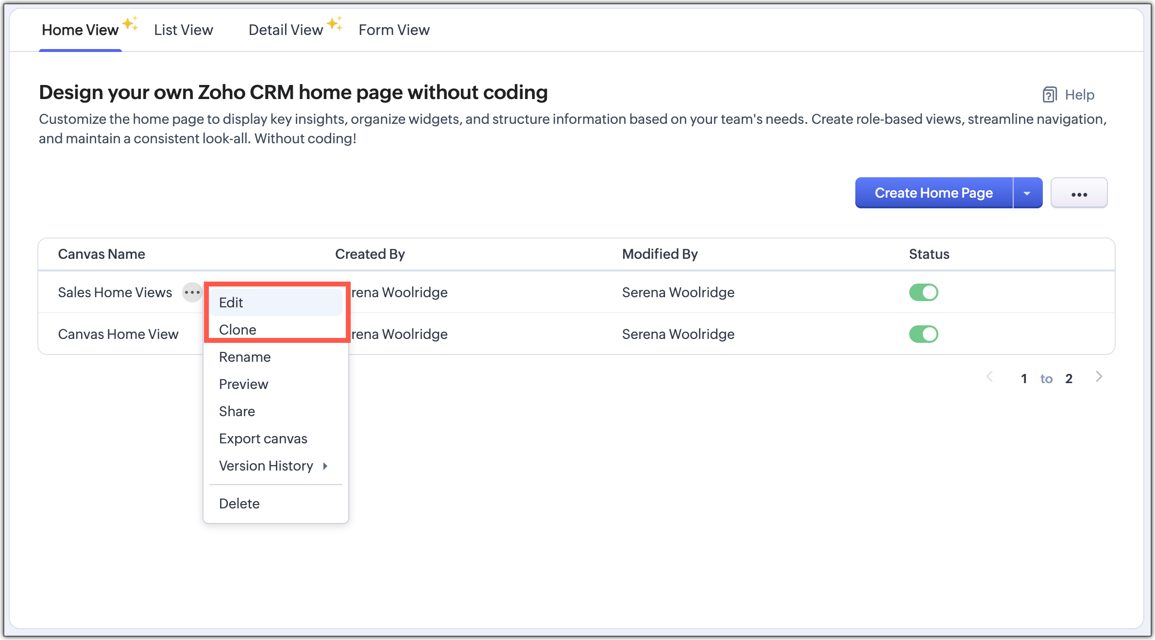 È possibile modificare una Home View in qualsiasi momento per aggiungere o rimuovere componenti, cambiare layout o colori e aggiornare azioni o campi obbligatori. È inoltre possibile clonare una vista e riutilizzarla se necessario.