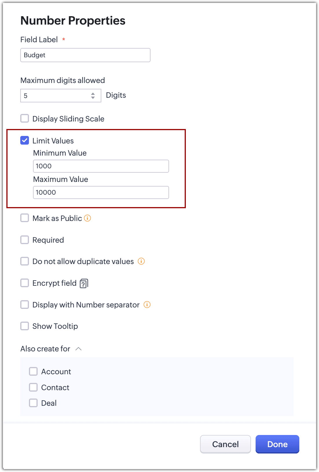 - Nel caso dei moduli Lead, Contatti, Account e Trattative, verrà visualizzata un'opzione aggiuntiva chiamata "Crea anche per". Utilizzarla per creare lo stesso campo per gli altri tre moduli in un'unica operazione. Questa opzione non è disponibile per il campo Valuta nei moduli personalizzati.