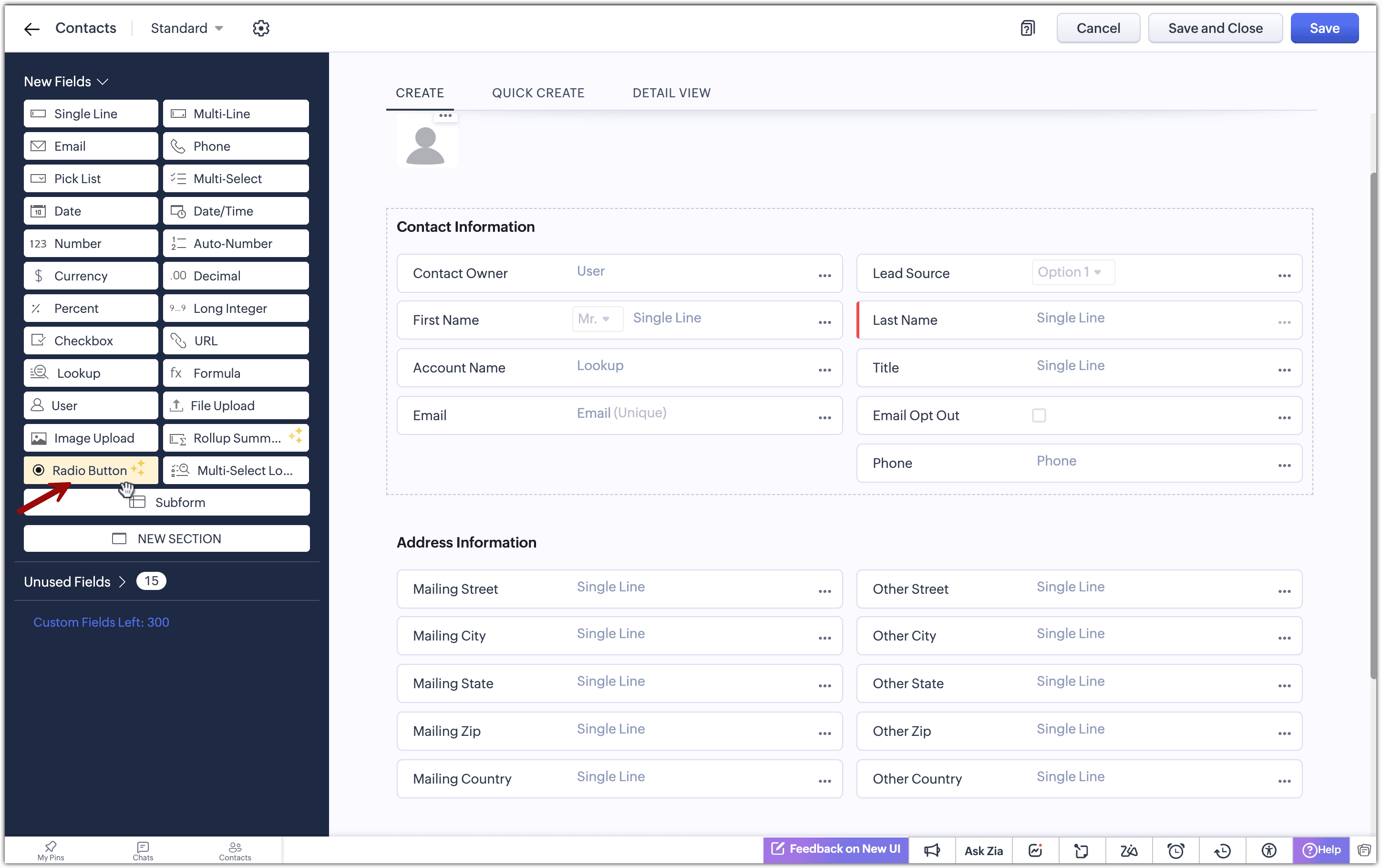- Selezionare un layout e poi trascinare e rilasciare il campo Rollup summary field dal pannello New Fields.
