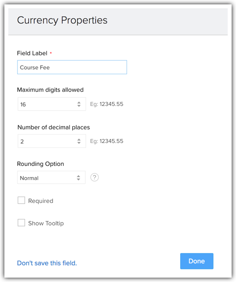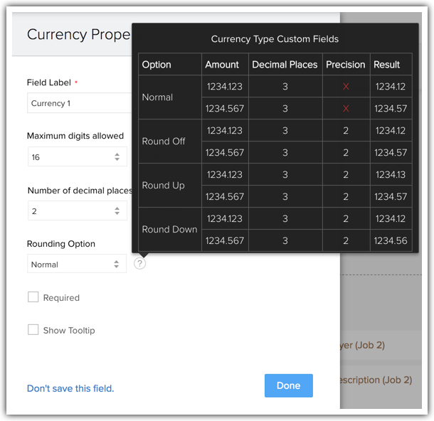 Il campo valuta consente di definire le impostazioni decimali e di precisione in base alla localizzazione della valuta selezionata. Sono disponibili quattro opzioni di arrotondamento per un campo valuta in Zoho CRM: