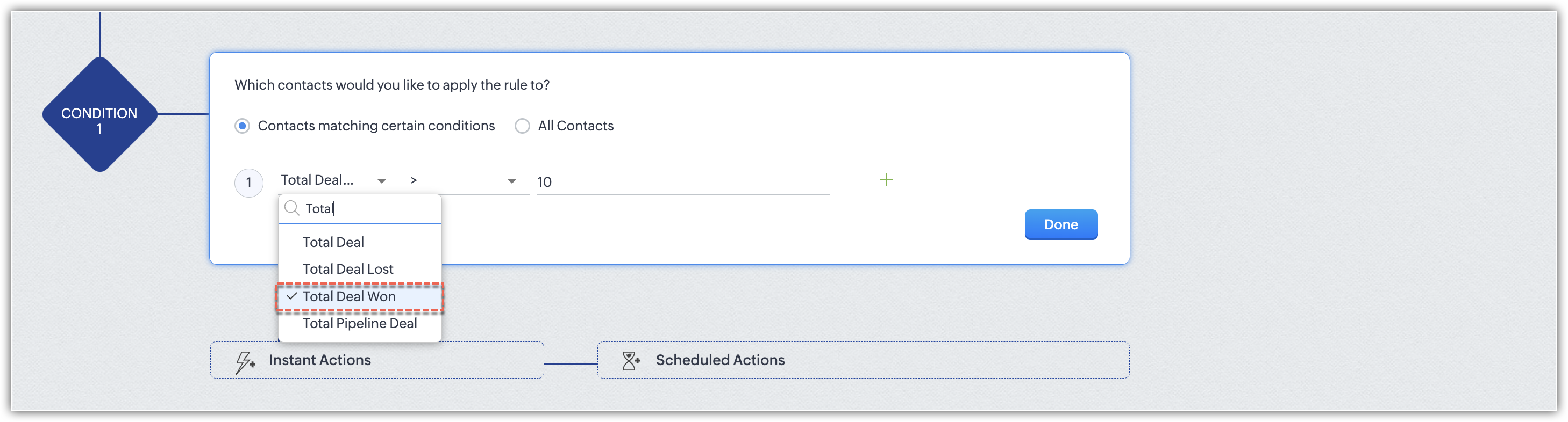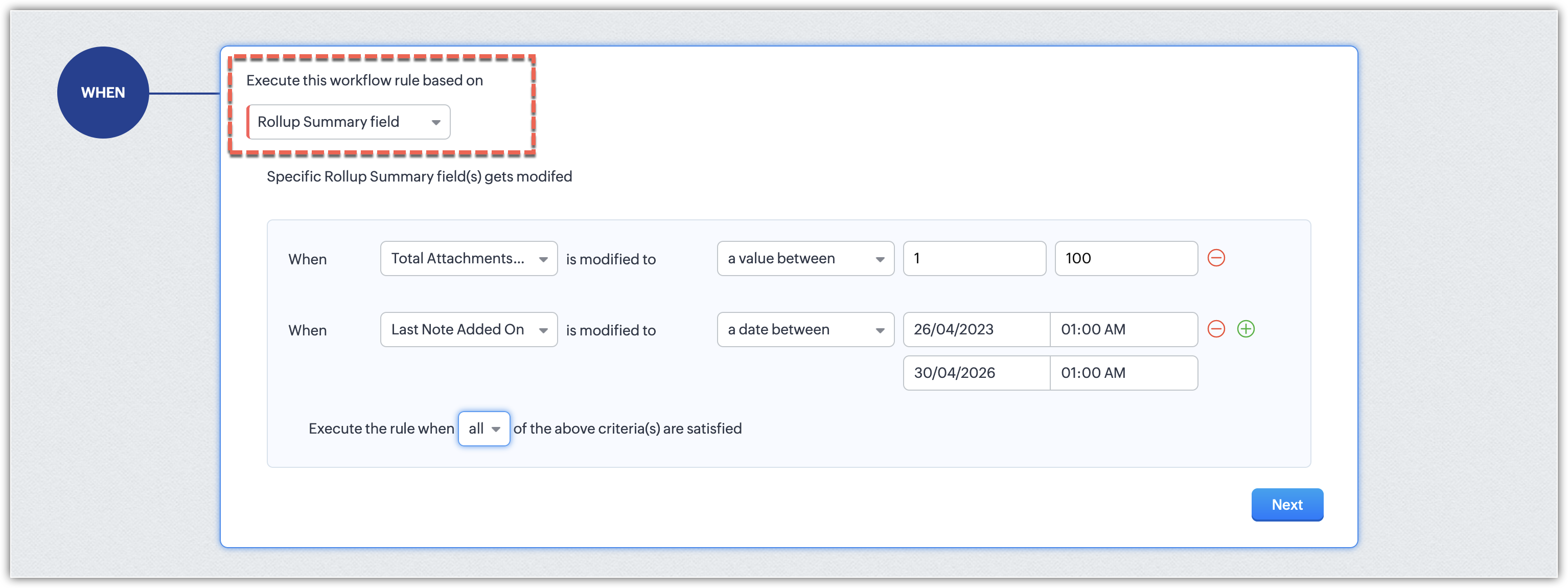 - I campi rollup summary saranno disponibili come opzioni di criteri per la configurazione delle condizioni della regola.
