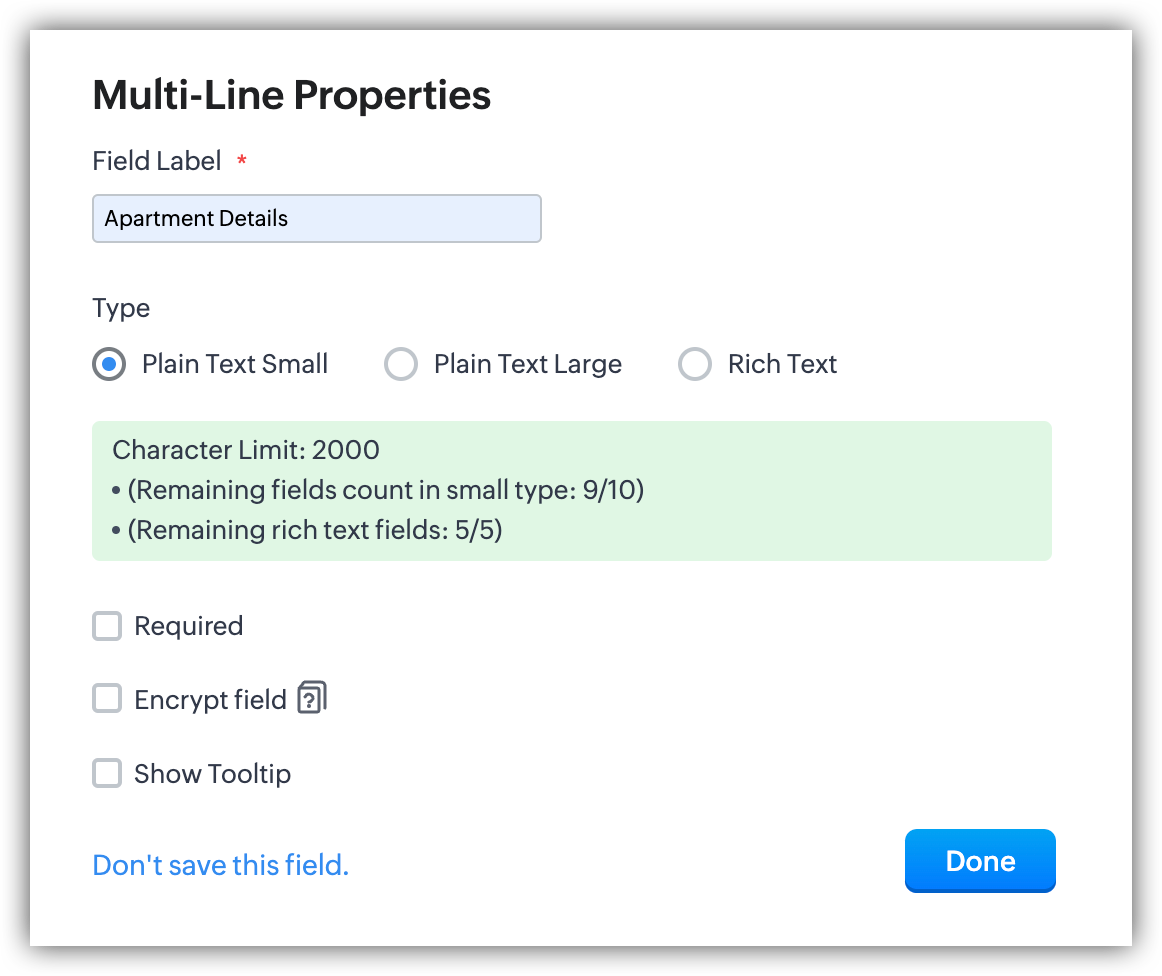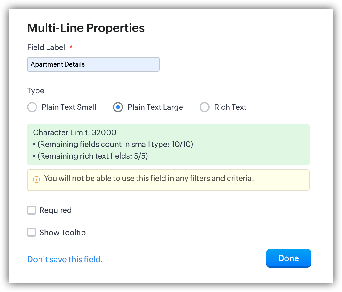 - Personalizzazione: Come altri campi in Zoho CRM, i campi multilinea possono essere personalizzati in base alle esigenze specifiche della propria attività. È possibile impostare limiti di caratteri e controllare in quali sezioni o layout vengono visualizzati.