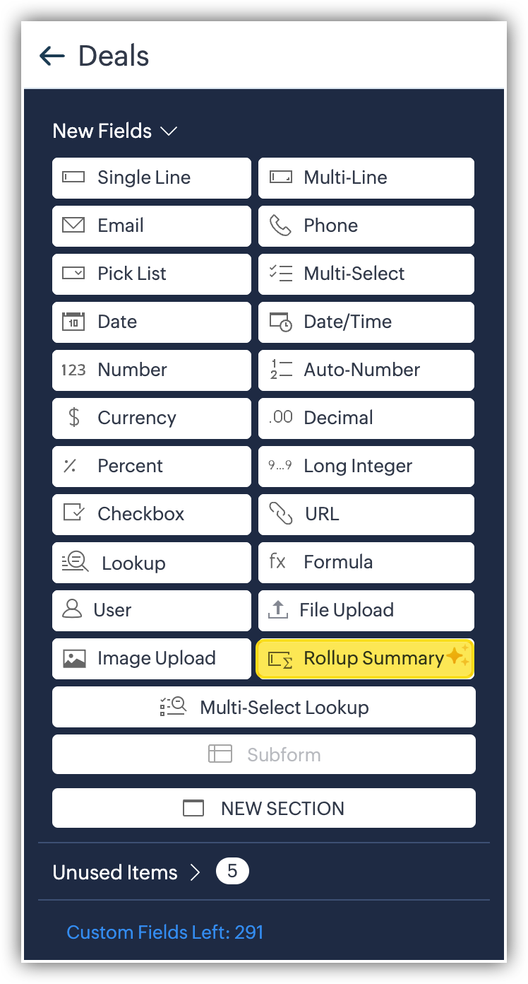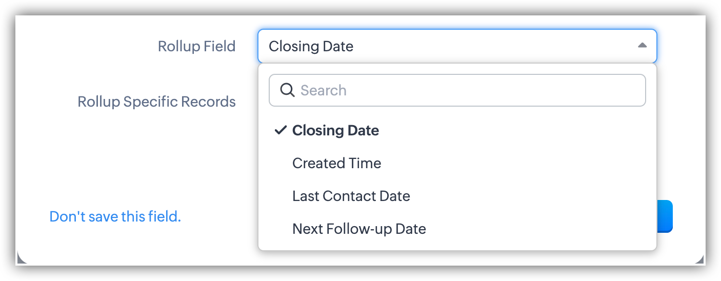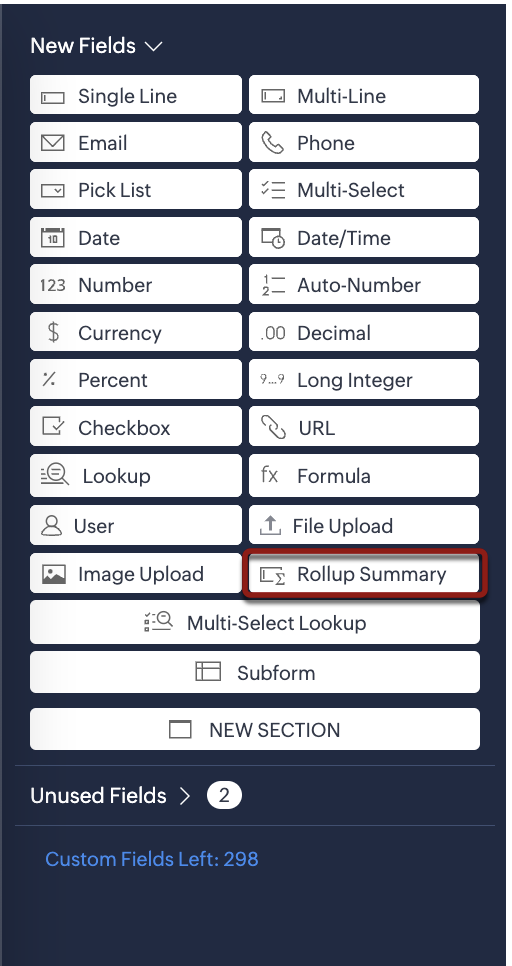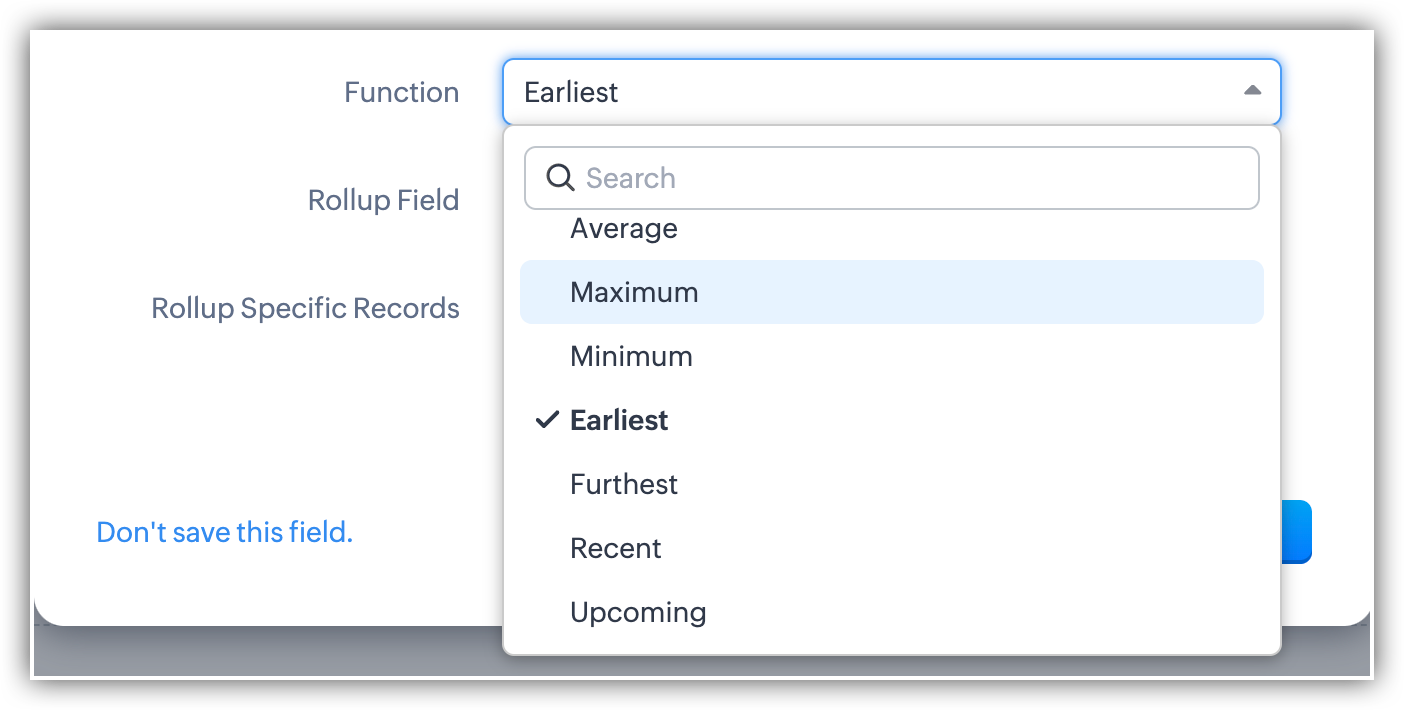 - Per i campi roll-up summary personalizzati, è possibile scegliere tra diverse funzioni a seconda del modulo rollup selezionato.