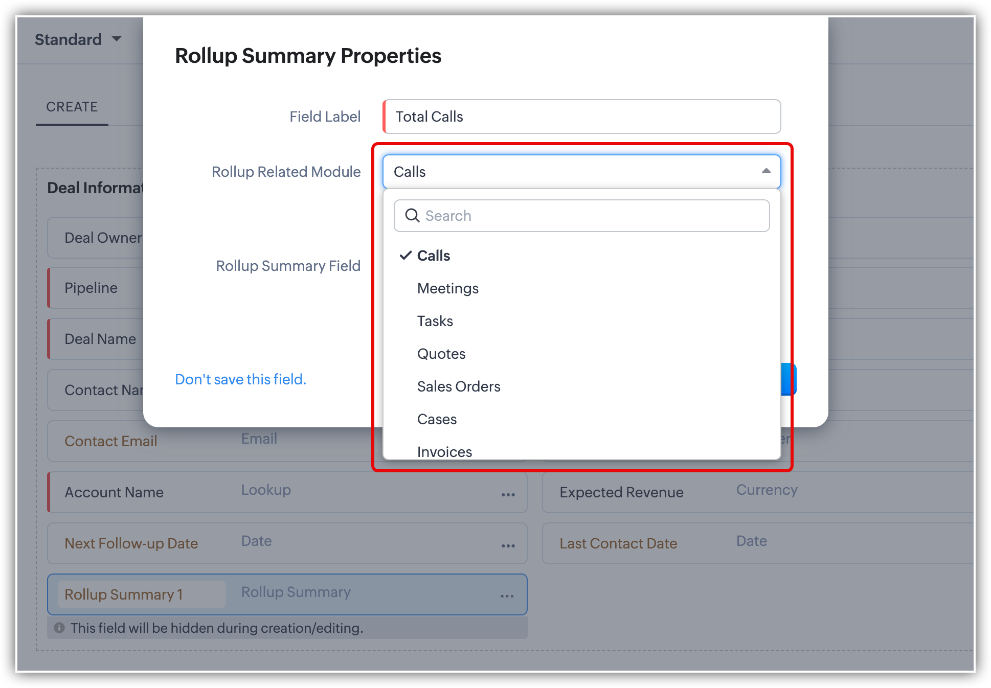 - I campi rollup sono disponibili in tutti i moduli eccetto Tasks, Calls, Meetings e Appointments.