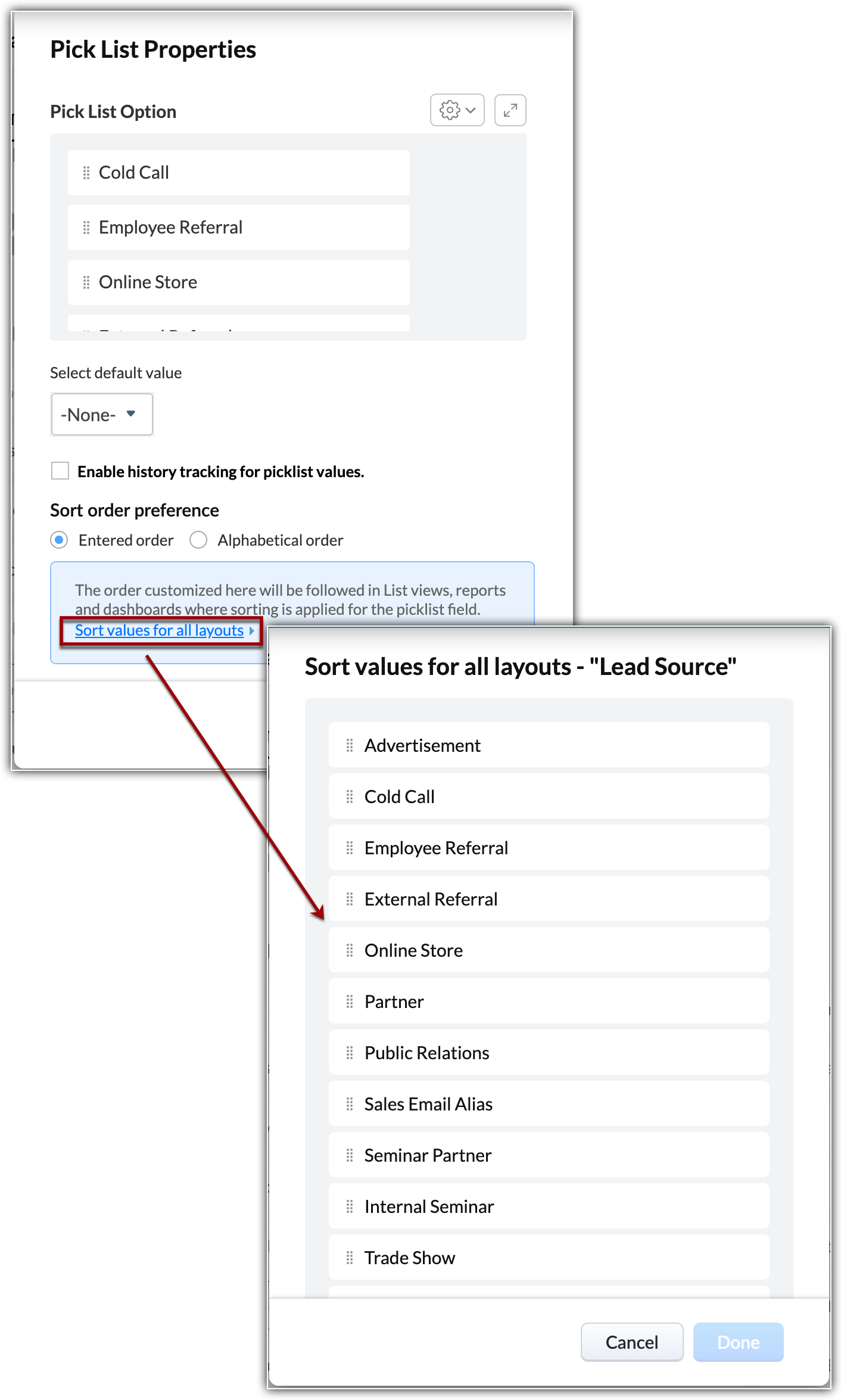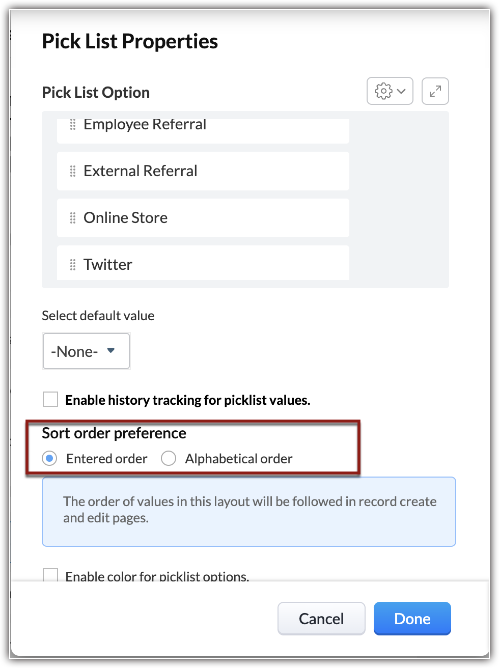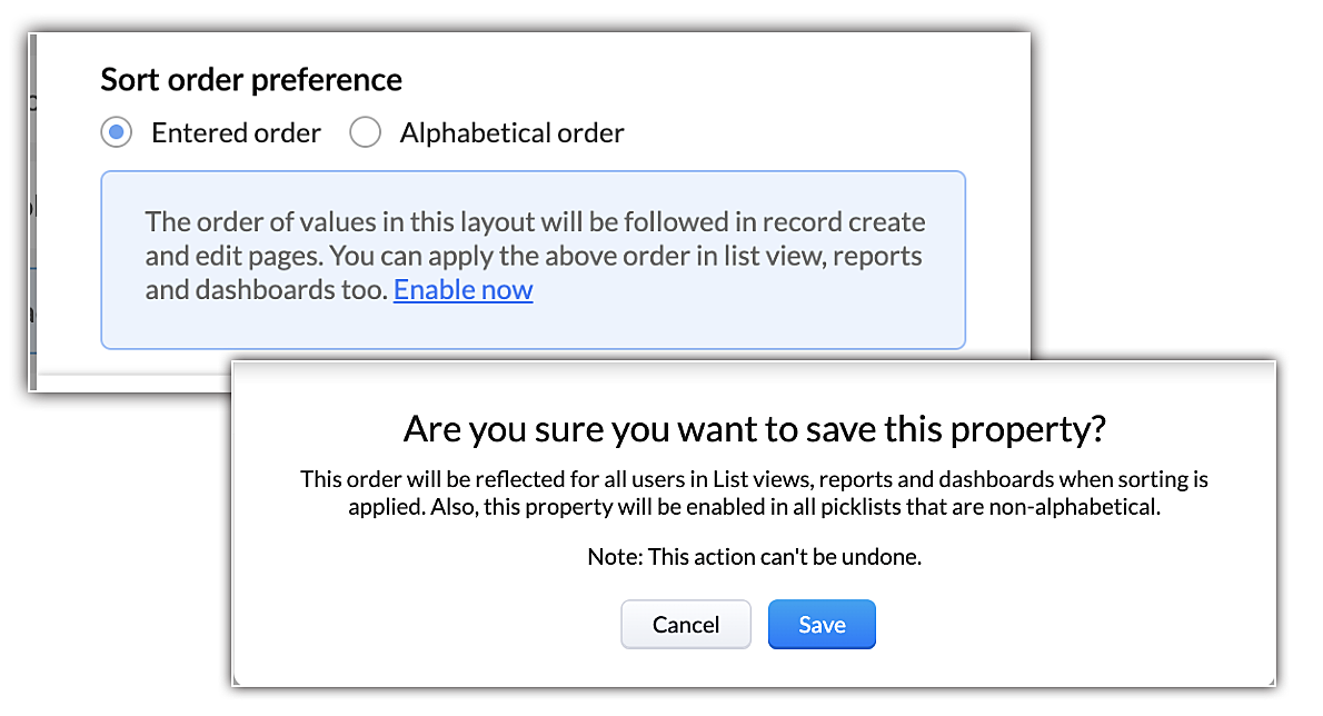 - Quando si aggiungono/rinominano/eliminano i valori, questi verranno automaticamente aggiornati nei record in cui sono già stati utilizzati. Prima di salvare, è possibile fare clic su Annulla per tornare al valore originale dell'elenco di selezione.